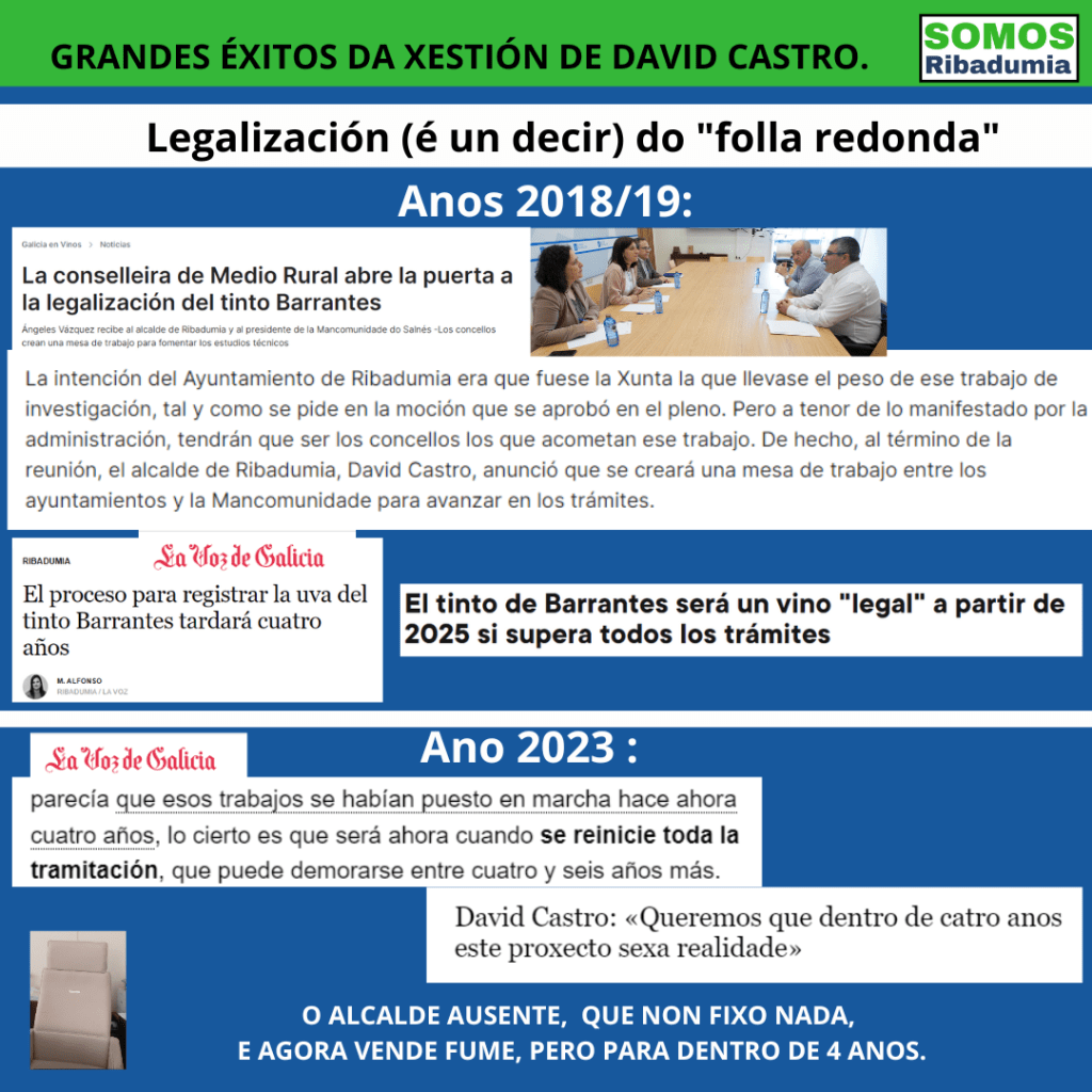 Nese momento, tal como explica o noso voceiro, Enríque Oubiña, “David Castro fixo uso das súa posición de alcalde para erixirse no gran defensor da legalización do folla redonda, acusando ao PP de non facer nada en anos anteriores, e presumindo dunha xuntanza coa Conselleira de Medio Rural naquel momento, Ángeles Vázquez, á que acudiu David Castro collido da man de Gonzalo Durán. E por suposto, fixo moita campaña ata as eleccións do 19 co discurso de que el ía lograr o que non fixo antes Salomé”.