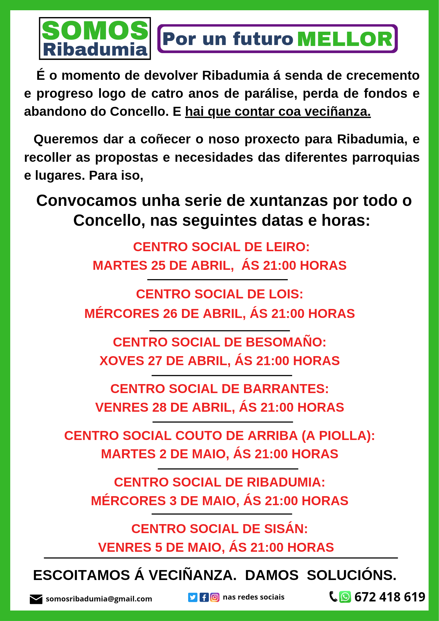 A partir do martes 25 de abril, e ata o venres 5 de maio, Somos Ribadumia imos realizar unha serie de encontros coa veciñanza ao longo e ancho de todo o concello. O obxectivo principal destas xuntanzas, que veñen a completar o traballo de rúa dos últimos anos, é o de escoitar á veciñanza, e afondar nas diversas problemáticas que poidan darse nas parroquias e lugares de todo o Concello, falar das solucións e falar tamén das propostas ou das cuestión que a propia veciñanza poida considerar de interese ou importantes e, en definitiva, ver como podemos axudar a mellorar a vida da xente de Ribadumia.