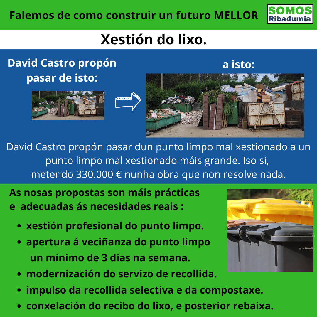 Dende Somos Ribadumia temos claro que a xestión dos residuos, que ten máis patas que o punto limpo, require dun plan de xestión integral do lixo. Os nosos compromisos para o caso de acceder ao goberno van nese sentido: de partida actualizar todo o servizo de recollida, comprar un novo camión, renovar os contedores, e poñer ao día o punto limpo, para o caso de que esa obra que lanzou David Castro non saia adiante, pois a día de hoxe, coa experiencia previa que temos, non podemos confiar en que nada do que David Castro anuncie se realice. Sexa co punto limpo actual ou con el reformado, o que si faremos será sacar a licitación o servizo de recollida e valeirado do mesmo, tal como estivo ata 2019, para non depender de recollidas puntuais. Tamén ampliaremos o horario de atención ao público un mínimo de dúas tardes máis ao longo da semana, mantendo por suposto a mañá dos sábados.