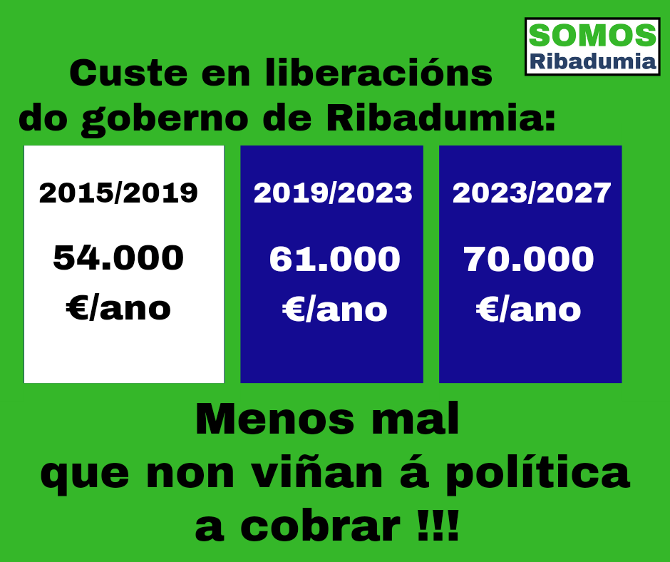 Máis aló disto, esta proposta supón o goberno máis caro dende que temos democracia, ao pasar dos 54.000€/que costou o goberno do 2015/19 aos 70.000€. Non está nada mal para o equipo que dicía que non viña á política a cobrar. En todo caso, insistir en que nós non nos opoñemos ás liberacións dentro do razoable. Ao que nos opoñemos é ao pago de favores con cartos públicos e a que se lle roube á veciñanza.