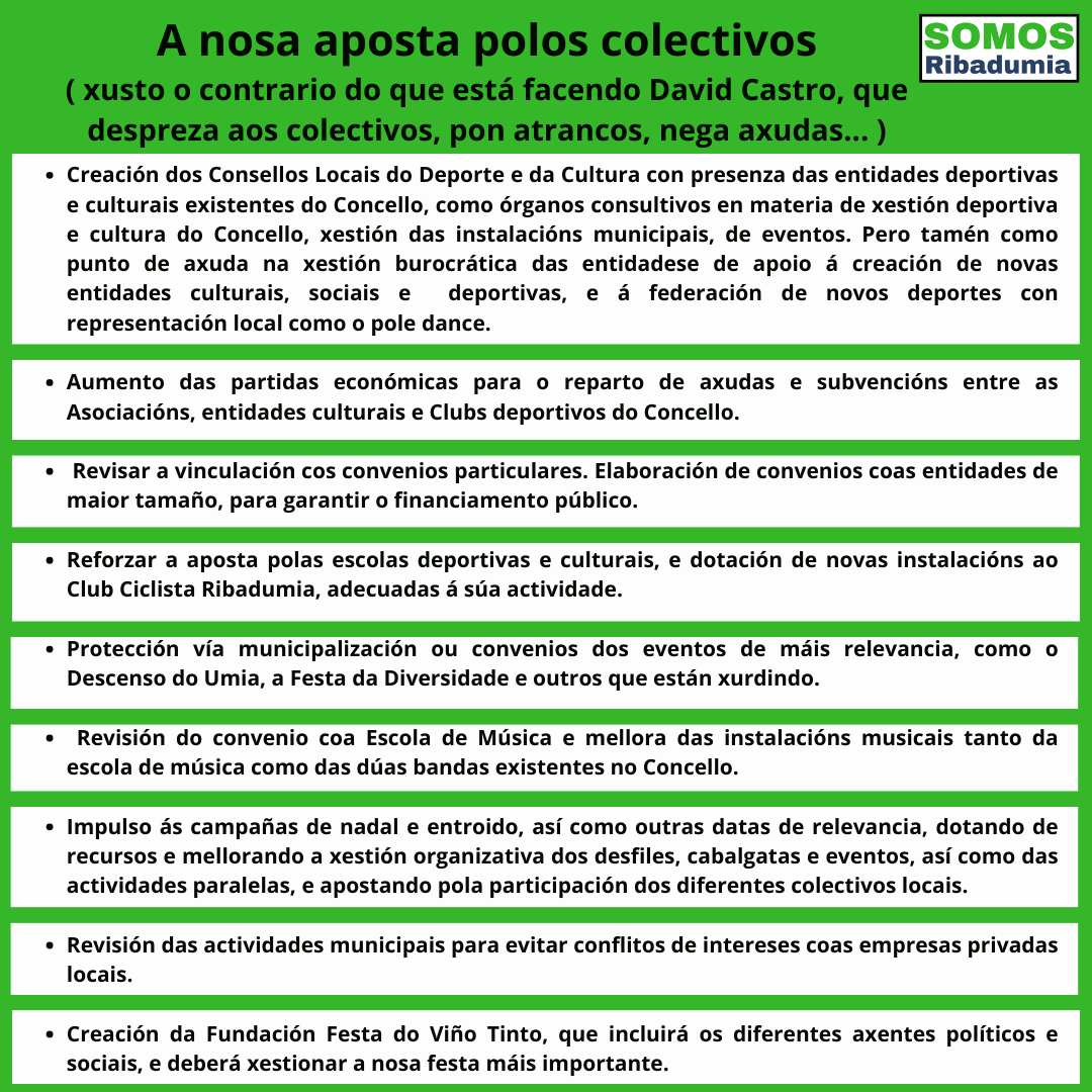 Dende Somos Ribadumia pedimos a David Castro que deixe de desprezar a maior parte dos colectivos que conviven no noso concello e actúe en consecuencia co seu cargo. Esiximos do alcalde de todos e todas que deixe de fuxir e se reuna cos colectivos que llo solicitan, que solucione problemas no canto de crealos, que deixe de intentar eliminar a determinados colectivos e que aumente as axudas que levan conxeladas dende o ano 2017, e que aprobe as deste ano de xeito inmediato.