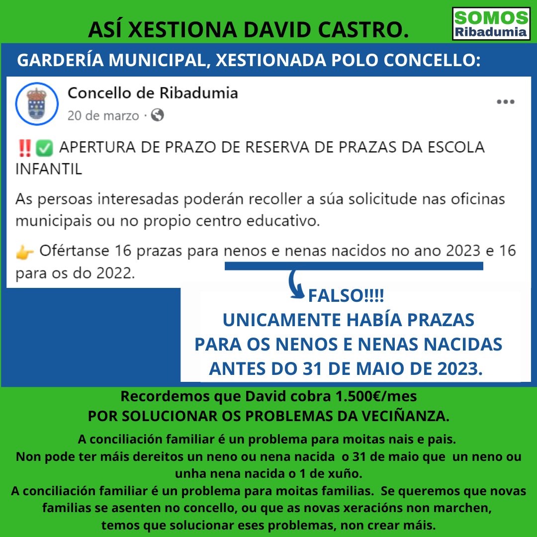 - A gardería municipal xestionada por david Castro non permite a reserva de praza para as nenas e nenos que vaian nacer no segundo semestre do ano ata o ano seguinte, deixando a moitas familias sen servizo cando o necesitan e cun problema de conciliación importante.
