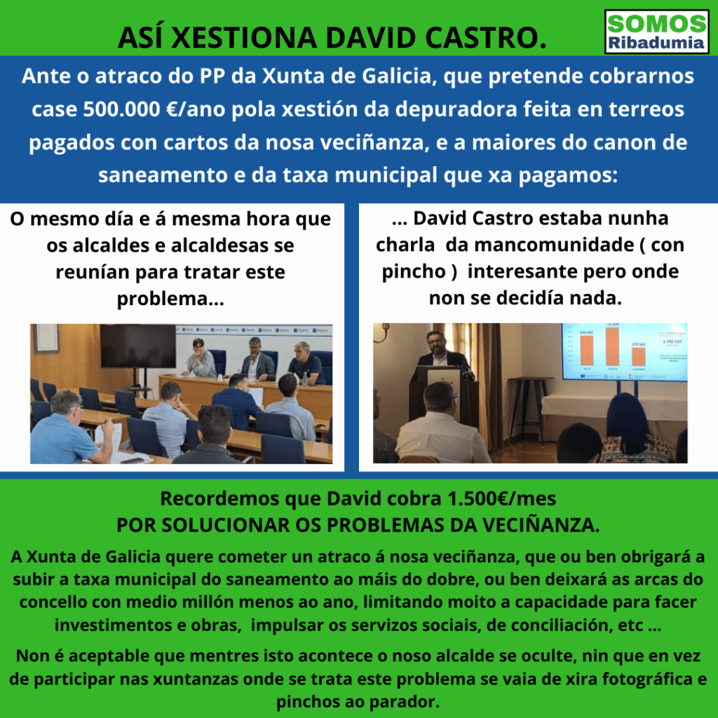 Este pasado martes, a FEGAMP mantivo unha xuntanza de alcaldes e alcaldesas para abordar estes tema, de suma importancia tendo en conta o pau que supón as arcas municipais, e a repercusión que vai ter nos petos da veciñanza, pois os concellos quedan abocados a subir mais pronto que tarde as taxas de saneamento para facerlle fronte. Pois resulta que ante unha reunión desa importancia, David Castro preferiu ir a un acto da mancomunidade onde unicamente se ían aportar datos de turismo e ao que perfectamente podería mandar a outra concelleira ou concelleiro. Unha actitude irresponsable a de David Castro que nos parece inaceptable. Un alcalde ten que estar nos sitios onde se fale dos problemas de Ribadumia.