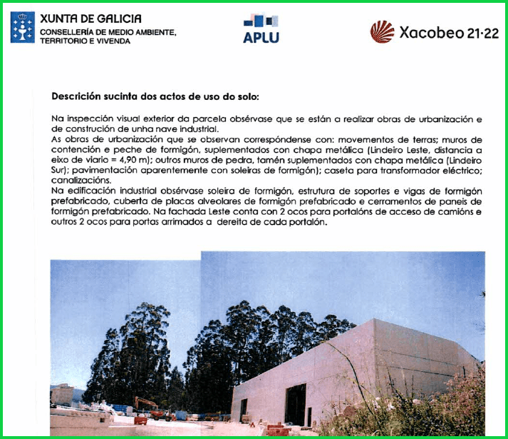 - No medio disto, o 9 de xullo de 2021 a empresa propietaria da nave presenta proxecto de edificación no concello, pero non consta ningún tipo de actuación municipal, nin concesión ou denegación do permiso, nin requirimento de documentación nin tampouco ningún expediente de paralización da obra ou reposición da legalidade.