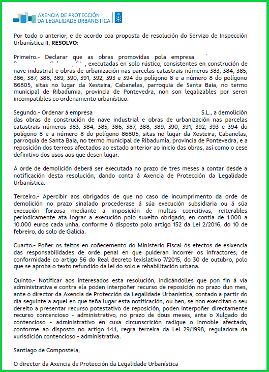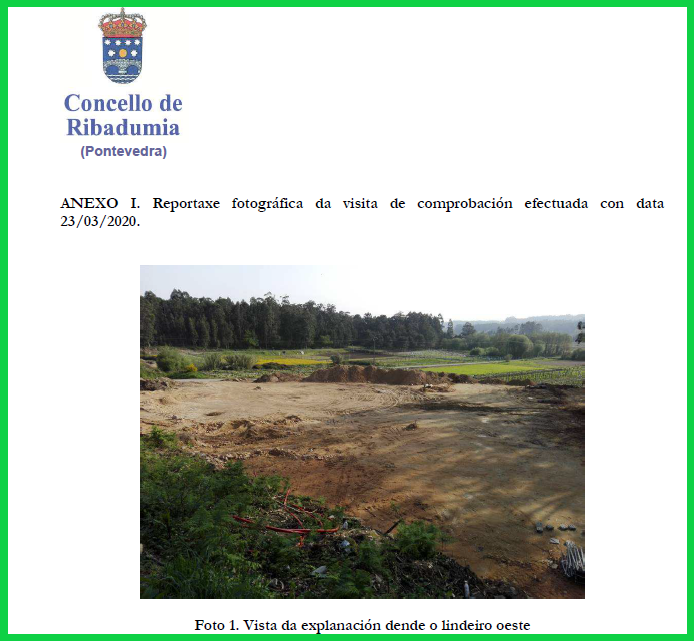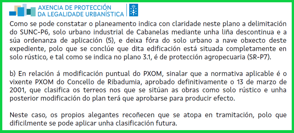- O 4 de xuño de 2021 aparece en escea a APLU, que detecta nesa finca unha nave en construción. Unha nave nun estado de obra xa moi avanzado, como demostran as fotos que figuran no propio informe da APLU, e que ata ese momento non tivera ningún tipo de intervención da administración local. O resultado de todo o proceso iniciado pola APLU é que en xaneiro de 2023 a APLU decreta a demolición da nave e reposición da legalidade. O 27 dese mes de xaneiro o Concello recibe da APLU o decreto completo, que resulta demoledor en canto a situación de ilegalidade desa nave e do resto de obras de acondicionamento realizadas.