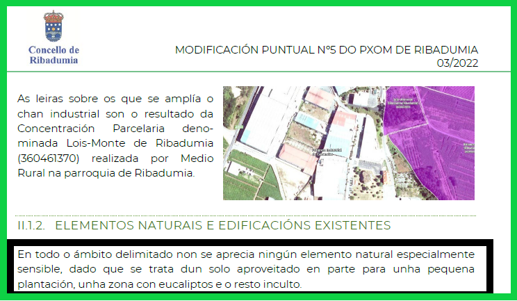 Na documentación da modificación do PXOM que se pretende levar adiante non se refire en ningún momento á existencia de edificacións ilegais e con orde de derribo, e refírese aos terreos a incluír na modificación como eucaliptal e terreo ermo nun sitios e como terreos sen uso noutros. Esta falsidade non só se recolleu na memoria da modificación, senón que se incluíu entre a documentación que se tramitou ante a Xunta para obter os informes sectoriais necesarios.