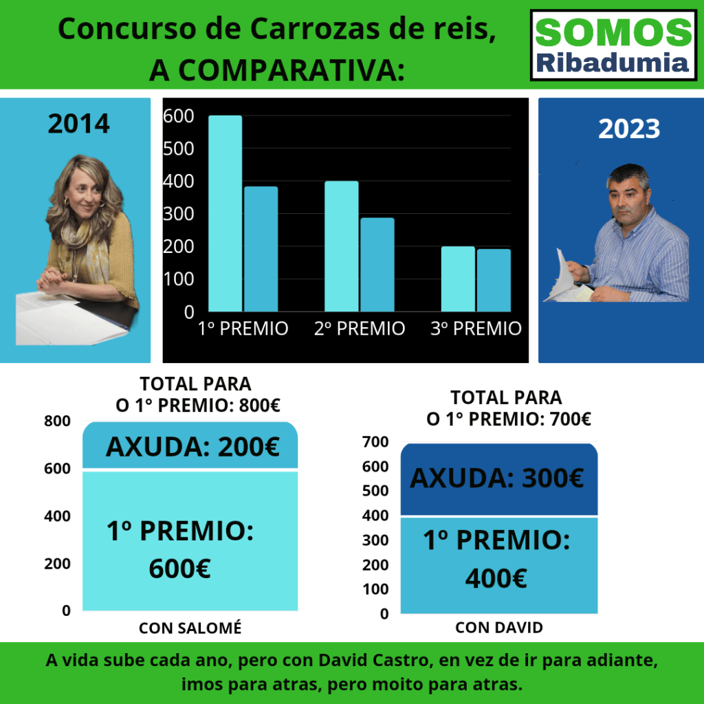 E non só se queda curto, ao noso parecer, o apoio a elaboración de carrozas. Os premios resultan menores que os ofrecidos por Salomé Peña na súa última convocatoria. En concreto Salomé entregou 600€ ao primeiro premiado, 400€ ao segundo e 200€ ao terceiro, unha cifra que no seu día xa levantou críticas por escasas. Agora David Castro ofrece premios de 400€, 300€ e 200€, unhas cantidades moi baixas.