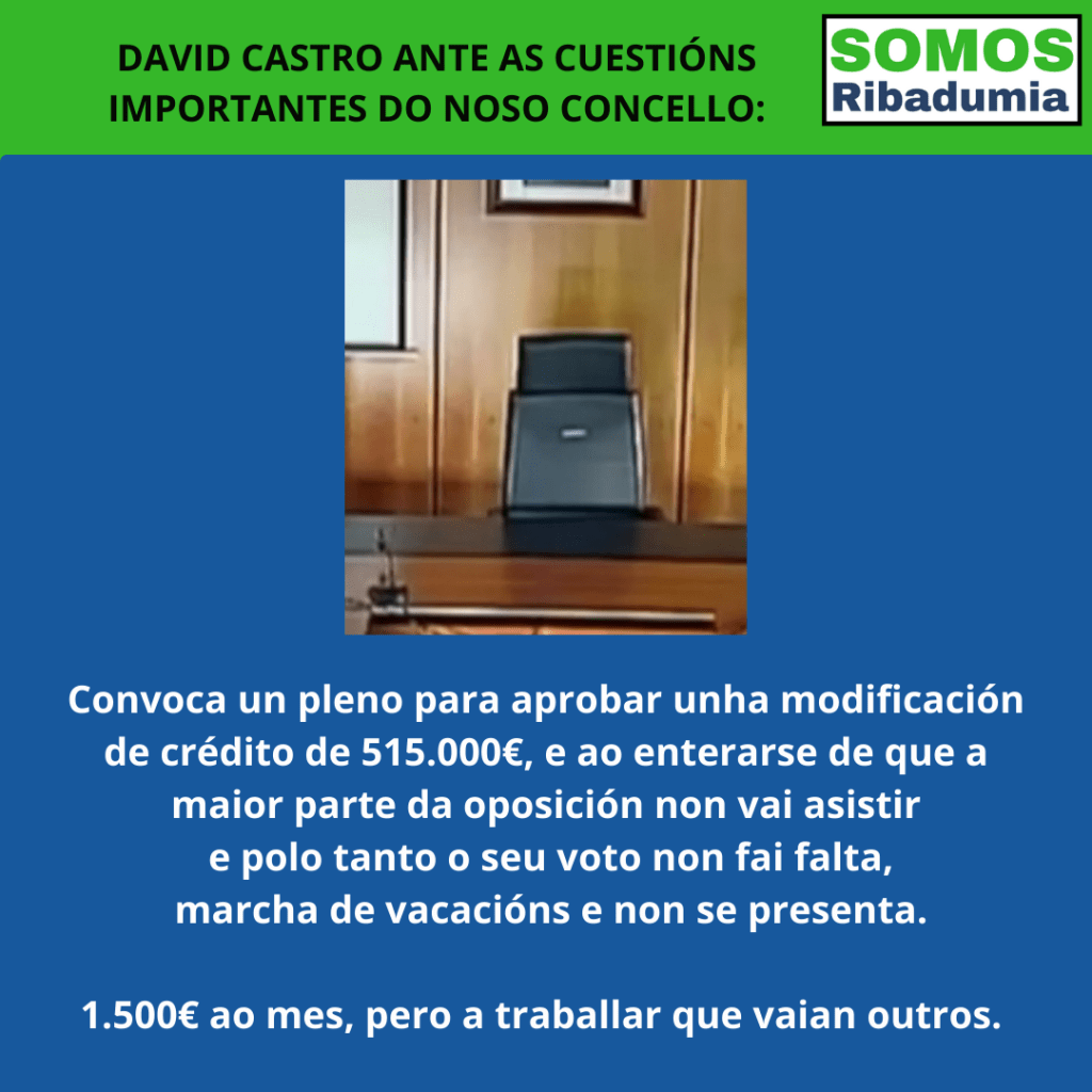Pero David Castro fixo oídos xordos. E fixo oídos xordos entre outros motivos porque nin sequera estaba no Concello. Resultou que David Castro convocou o Pleno Extraordinario, pero unha vez tivo coñecemento de que boa parte da oposición non ía participar nese pleno, vendo que o seu voto non era necesario para aprobar o único punto a tratar, foise de vacacións. Dende Somos Ribadumia non podemos aprobar esta maneira de actuar, que nos parece totalmente irrespectuosa cara as persoas que forman a corporación, incluídos os seus propios compañeiros e compañeiras de partido, sen os cales a modificación de crédito non sairía adiante. “O señor Castro puido convocar este pleno a principios do mes de decembro, ou en calquera data na que el tivera dispoñibilidade para asistir sen entrar en conflicto coas súas vacacións, e despois, sabendo a situación sobre vida que tivemos e que tres forzas políticas solicitamos o aprazamento dese pleno, puido aprazalo uns días, que non pasaba nada. Pero, tendo todas as opcións, optou pola soberbia e o desprezo. O señor Castro debería recordar que os alcaldes teñen responsabilidades, e que os 1.500€ que cada mes lle paga toda a veciñanza non son para sufragar ese tipo de actitudes”.