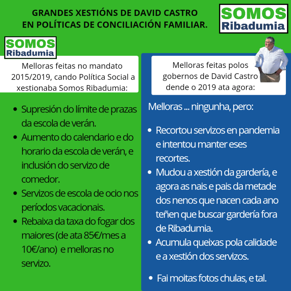 Se falamos da escola de verán, as únicas melloras, eliminación do límite de prazas, aumento de horario e calendario e servizo de comedor se realizaron nos anos nos que política social a levou Somos Ribadumia. Dende entón, ese servizo só tivo recortes que David Castro unicamente rectificou neste pasado 2023 logo de numerosas queixas. Ademais, hoxe por hoxe a maior parte dos concellos da contorna aportan servizos similares, nalgún caso incluso con mellores prezos, así que tampouco se pode dicir que Ribadumia actualmente sexa exemplar en nada.