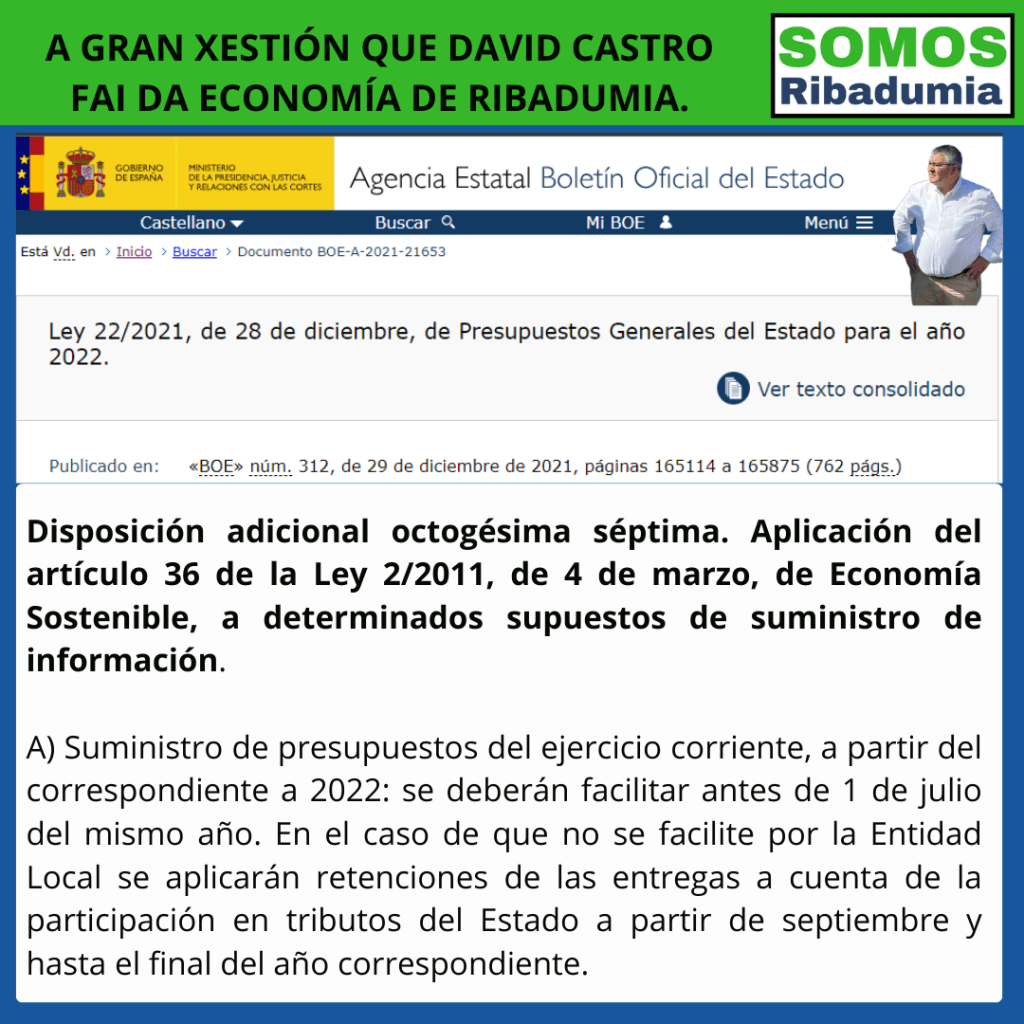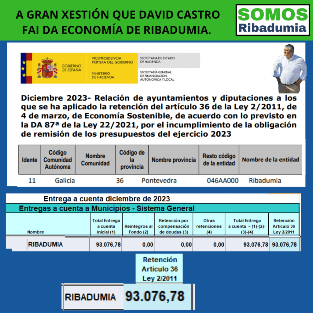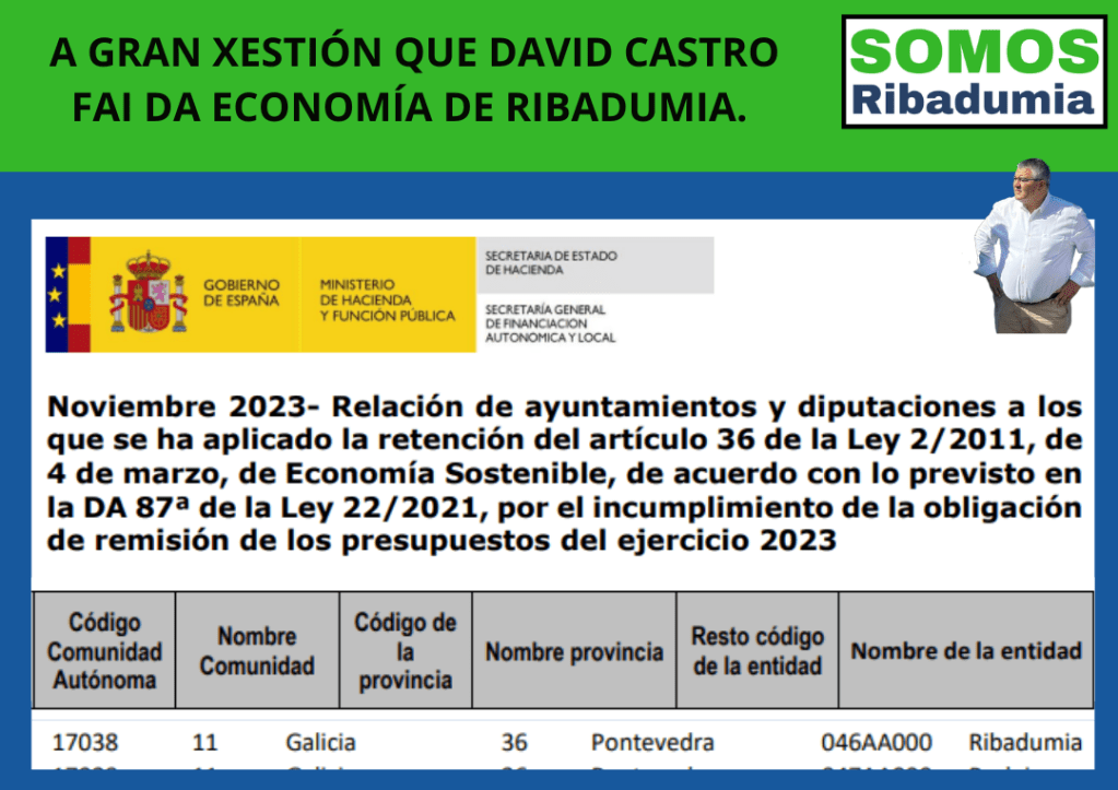 Resulta totalmente inadmisible esta desidia e este abandono do control do funcionamento económico do noso Concello, que vai máis aló deste lance, que ao fin é un máis. Estamos sen orzamento dende o ano 2022, o resultado contable do ano 2022 está nestes momentos, xaneiro de 2024, en exposición pública,un retraso desproporcionado que pon a Ribadumia tamén fora da lei e que pode traer consecuencias legais e problemas para acceder aos fondos do estado e da Xunta e Galicia, así como outras axudas que requiren cumprir coa lexislación económica. Non é a primeira vez que o tribunal de contas apercibe a David Castro pola súa penosa xestión económica, enon será a última, visto o visto. Pero despois dos apercibimentos veñen as multas e as consecuencias, que como sempre van pagar os veciños e veciñas de Ribadumia.