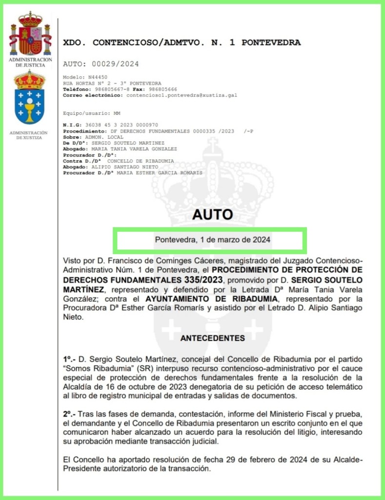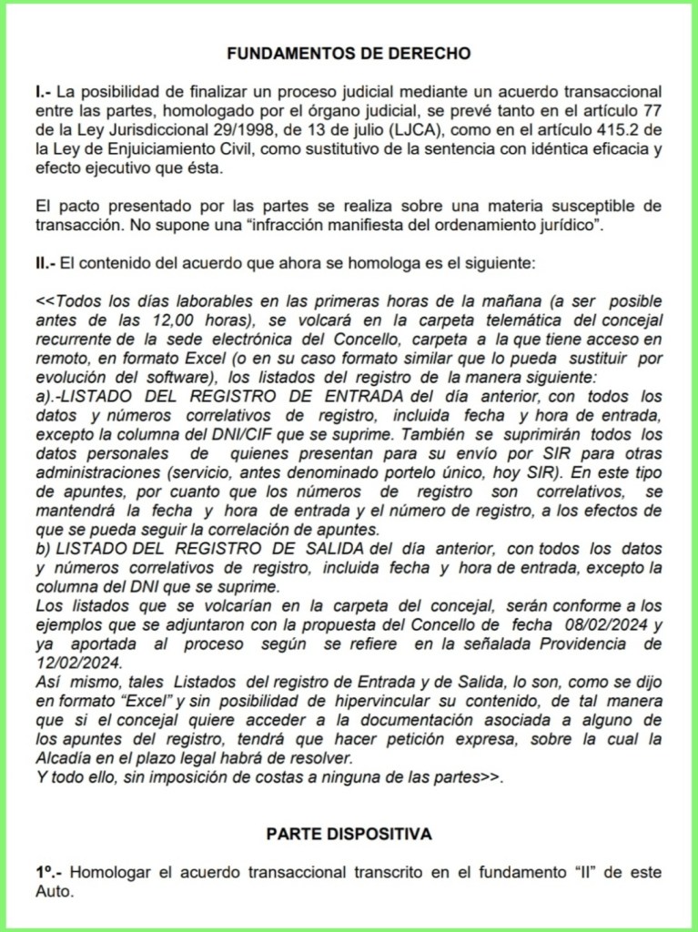 O 1 de marzo o xuíz, ditou un auto dando por válido o acordo quedando xa ratificado e en completa validez dende ese momento, o cal significa que o Concello de maneira diaria debe subir ao espazo privado que Sergio Soutelo ten na sede electrónica, un espazo seguro e ao que só pode acceder el, os datos básicos de todas as entradas e saídas do rexistro municipal. Un acordo que garante todos os dereitos legais e é acorde a lexislación en cuestión de protección de datos, pois só se aportan datos moi básicos, non os expedientes completos, que se deben solicitar a parte e teñen outro proceso. Tampouco se inclúen cuestións que se presenten a través do portelo único e non vaian dirixidas ao Concello. Así pois, é o equivalente a consultar o antigo libro de rexistro de papel.