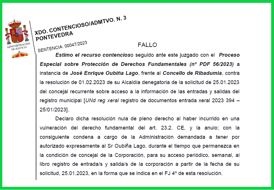 Esta é a segunda vez que dobramos o brazo de David Castro nun Xulgado, a anterior foi o ano pasado cando un xuíz obrigou ao Alcalde a darlle acceso a Enrique Oubiña ao rexistro municipal, logo de tres ano e medio de loita pola vía pacífica que non deu froitos e nos obrigou a ir ante a xustiza.