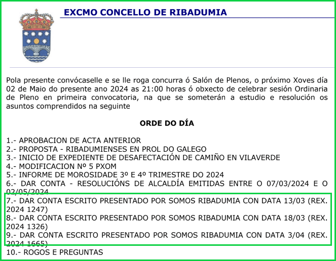 - Na Orde do Día do Pleno inclúe tres puntos de “dar conta” referidos a Somos Ribadumia, pero oculta o contido deses puntos.