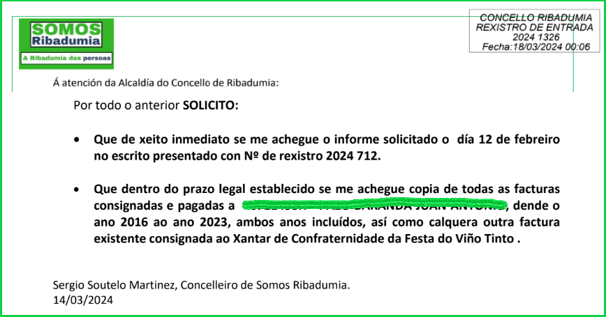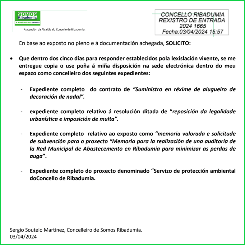 Tamén hai que remarcar que estes non son os primeiros escritos que presenta Sergio Soutelo. No que levamos de mandato o noso Concelleiro leva presentados mais de 30 escritos, boa parte deles pedindo diversa documentación, que sempre se entrega tarde e logo de moitos atrancos, pero ata agora David Castro non fixo esta xogada do Pleno, que si fixo no mandato anterior en varias ocasións e sempre para xustificarse ante un terceiro, naqueles casos a Valedora do Pobo de Galicia e o Defensor del Pueblo de España.