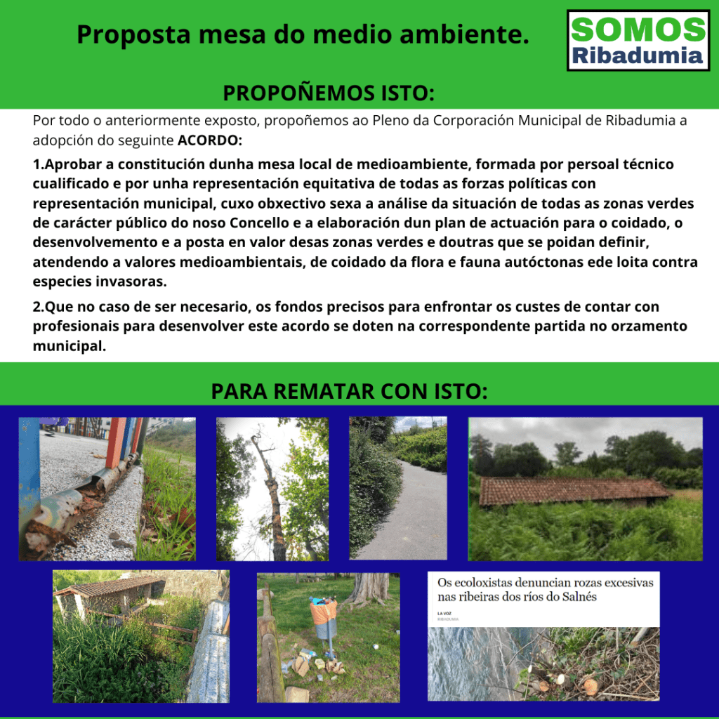 Dende a nosa formación pensamos que a Concellería responsable dos parques e xardíns, debe hoxe por hoxe ser unha Concellería con moito máis desenvolvemento. Por ese motivo presentamos este pasado xoves unha moción onde propoñemos a creación dunha mesa local do medio ambiente, formada por persoal técnico cualificado e por representantes de todos os partidos políticos, co obxectivo de elaborar, avaliar e poñen marcha un plan de actuación e posta en valor que permita unha planificación a medio e longo prazo dos nosos espazos de lecer, o cal facilitaría enormemente a xestión en todos os aspectos.