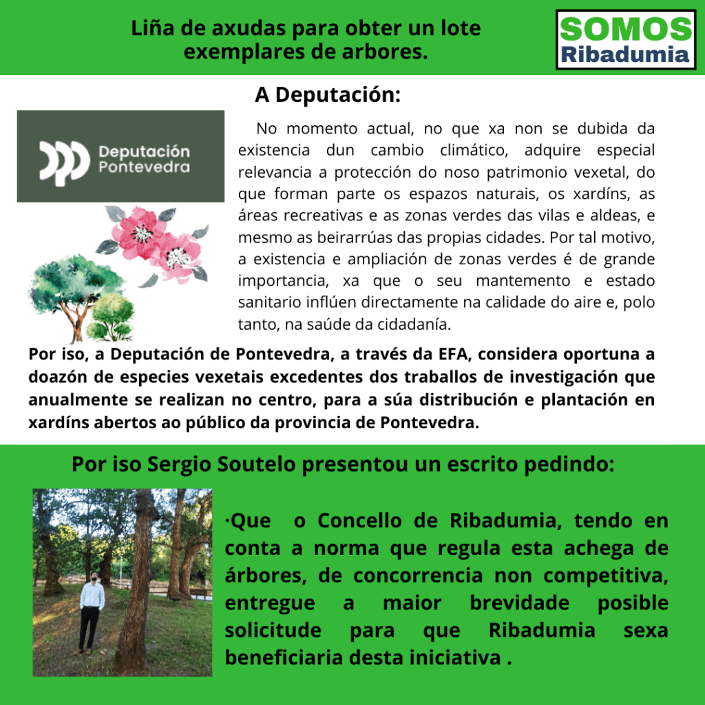 Con independencia do falado, días atrás o noso concelleiro Sergio Soutelo presentoulle á alcaldía unha solicitude onde animaba a acollerse a unha liña de axudas da Deputación, publicada a principios de maio e que permitiría recibir un lote de árbores, ata 35, cos cales sería posible por exemplo repoñer parte do arborado perdido na Carballeira de Ribadumia, aínda que respectando a quen goberna non expuxemos ningunha preferencia. Si solicitamos que se fixera a maior brevidade dado o carácter de concorrencia non competitiva da liña de axudas. Pensamos que acollerse a este tipo de axudas, que son bastante escasas, se ademais se fixera contando de antemán co plan de desenvolvemento que propoñemos crear, axudaría moito á mellora das nosas zonas verdes e de lecer.