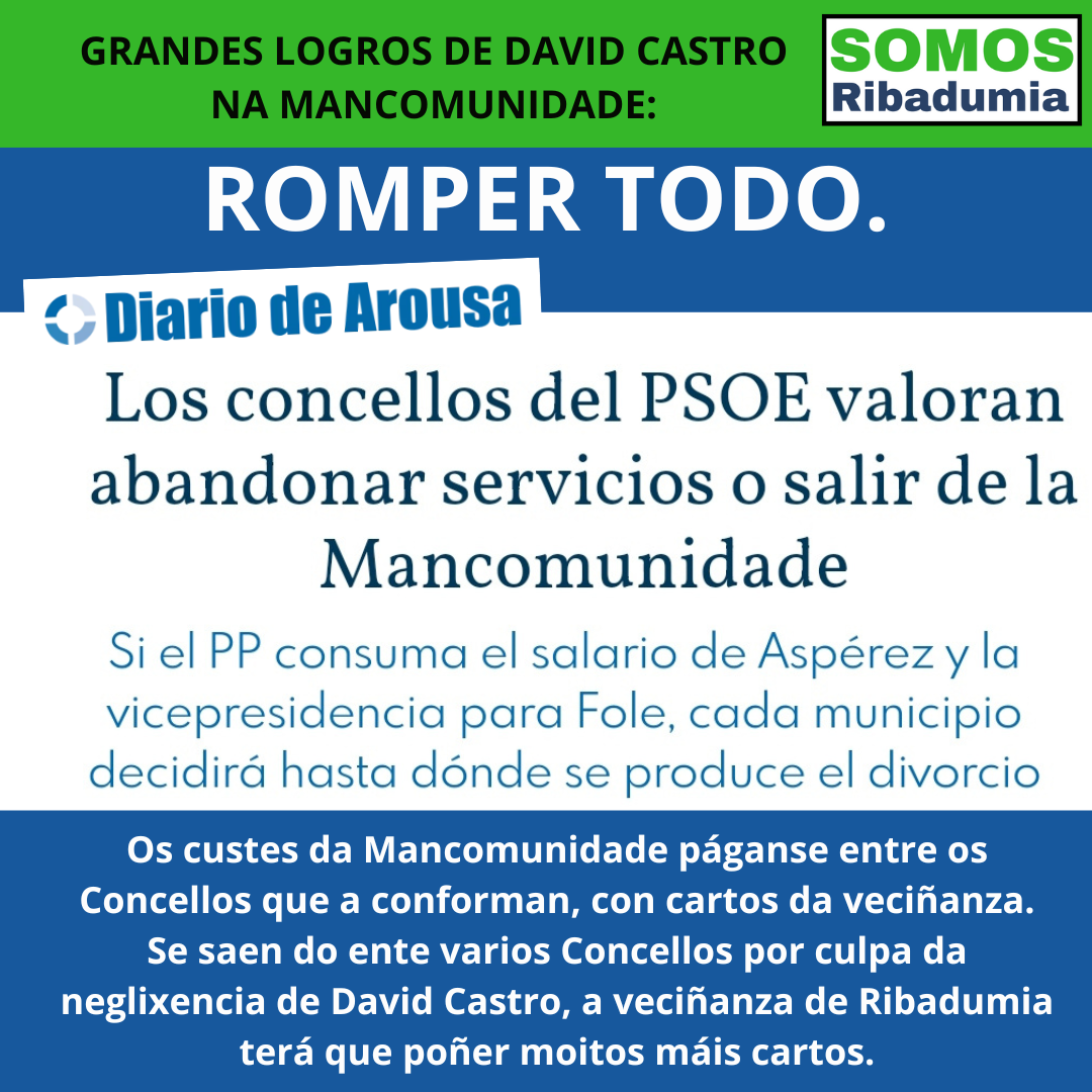 David Castro actúa con total irresponsabilidade, poñendo en risco un ente que gracias á suma de todos os concellos que o compoñen, non só permite que determinados servizos sexan asumibles para Concellos pequenos como o noso, senón ademais que permite acceder a fondos económicos doutras administracións, que están agora en risco gracias á xestión dun señor que está unicamente traballando en beneficio persoal propio, algo indigno en política.