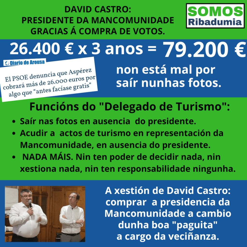 Dende Somos Ribadumia xa advertimos da nosa oposición frontal a que David Castro pague cos cartos da nosa veciñanza favores políticos, que é xusto o que vai acontecer este venres se David Castro saca adiante a súa idea de aprobar no Pleno da Mancomunidade unha liberación económica para o señor Asperez, unha liberación que con todos os custes andara próxima aos 40.000€ ao ano, e que suporá dispor de 120.000 € no que queda de mandato, dos cales 80.000€ irán dereitos ao peto de Asperez, que vai ter a máis que dubidosa honra de ser o primeiro liberado na historia da Mancomunidade.