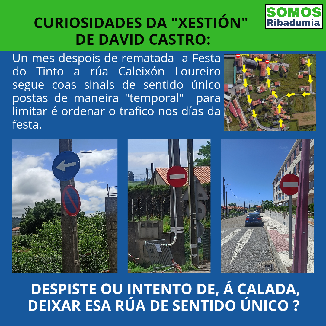 Un mes despois de rematada a festa, dende Somos Ribadumia comprobamos que algúns dos sinais temporais colocados para restrinxir e guiar o tráfico nalgunhas desas rúas seguen colocados. Referímonos en concreto á rúa Caleixón Loureiro. Na intersección desa rúa coa rúa capela e a rúa Remediós Alvarez, e ao longo da rúa Caleixón Loureiro hai colocados unha serie de sinais, tanto de dirección única, como de dirección prohibida e de prohibido estacionar. Dáse a circunstancia de que varios deses sinais non son homologados e/ ou están colocados dun xeito evidentemente pensado para ser temporal, pois aparecen amarrados de calquera maneira a postes que non corresponden coa sinalización de vías. Ademais para a colocación dalgún dos sinais procedeuse á retirada doutros que deben estar presentes.