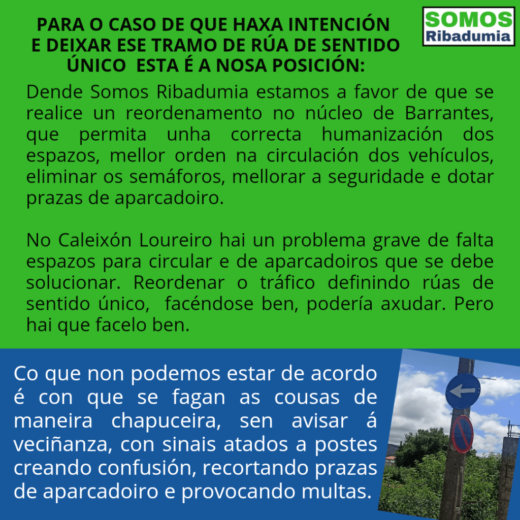 Dende Somos Ribadumia entendemos que todo o centro de Barrantes debería someterse a unha actualización urbanística, de humanización e reordeamento do tráfico, eliminación dos semáforos, mellora da seguridade e dotación de aparcadoiros. E nesta zona en concreto do Caleixón Loureiro, os problemas circulatorios e de faltas de aparcadoiro son moi graves, máis dende que se ocupou o último edificio de vivendas, entre 2019 e 2021. Pola nosa banda levamos no noso programa, e veríamos como moi positivo unha reordenación do tráfico nesa zona, e dotar prazas de estacionamento. Pero as cousas hai que facelas ben, non de maneira chapuceira, con sinais mal colocados e amarrados a postes, recortando zonas de estacionamento, e aínda por enriba facelo con escurantismo e condenando á veciñanza a enterarse dos cambios vía multa.