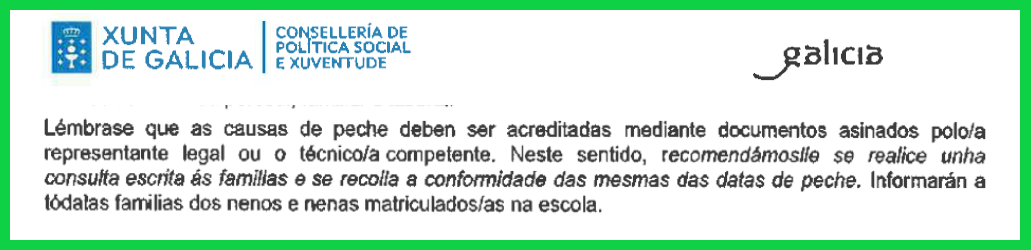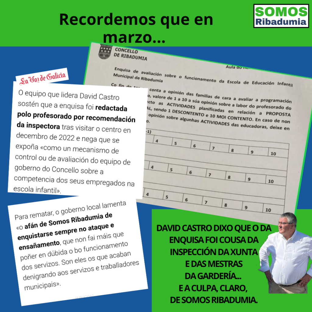 O que non conten o informe da Xunta é ningunha proposta nin recomendación de que se lle manden ás nais e pais enquisas de valoración do profesorado como a enviada o pasado mes de marzo, e tal como asegurou David Castro naquel momento . Si se recomendan enquisas para valorar cales son os mellores días para pechar a gardería, e que non se peche determinadas datas por decreto como se está facendo, cousa eu tampouco se fixo. Así pois, demóstrase que unha vez máis David Castro mentiu ao tentar cargarlle a responsabilidade dos seus feitos a un terceiro, neste caso a Consellería de Política Social, e unha vez máis as súas mentiras quedan demostradas por documentos asinados e con número de rexistro.