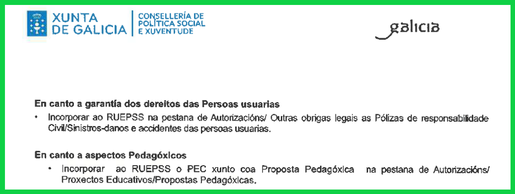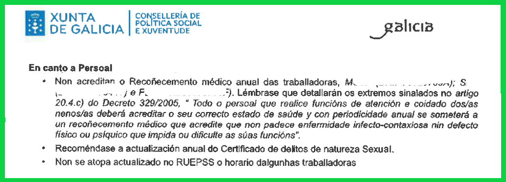 - Irregularidades no funcionamento, con persoal sen pasar o recoñecemento médico e sen horarios definidos na Xunta e co Certificado de delitos de natureza sexual sen actualizar.