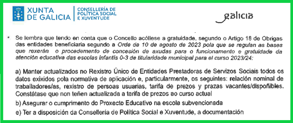No relativo ás garantías para os nenos e nenas, o Concello ocultoulle á Xunta de Galicia as pólizas dos seguros de responsabilidade civil e sinistros cos que debería contar a Escola Infantil, que dende a nosa formación solicitaremos formalmente, non vaia a ser que aconteza como co desfile de entroido, que non tiña seguros específicos.