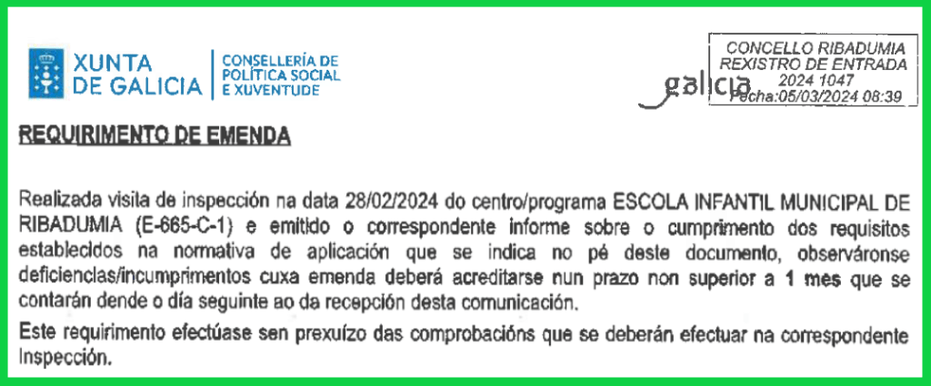 E pasa o mesmo con boa parte da documentación que é obrigatoria ter incorporada ao rexistro da Xunta, e que o Concello non incorporou dende a municipalización da escola infantil. Estes incumprimentos supuxeron a advertencia da Xunta de Galicia de que de non resolverse a escola infantil podería ser expulsada da rede de escolas infantís financiadas pola Xunta e perder así a súa gratuidade.