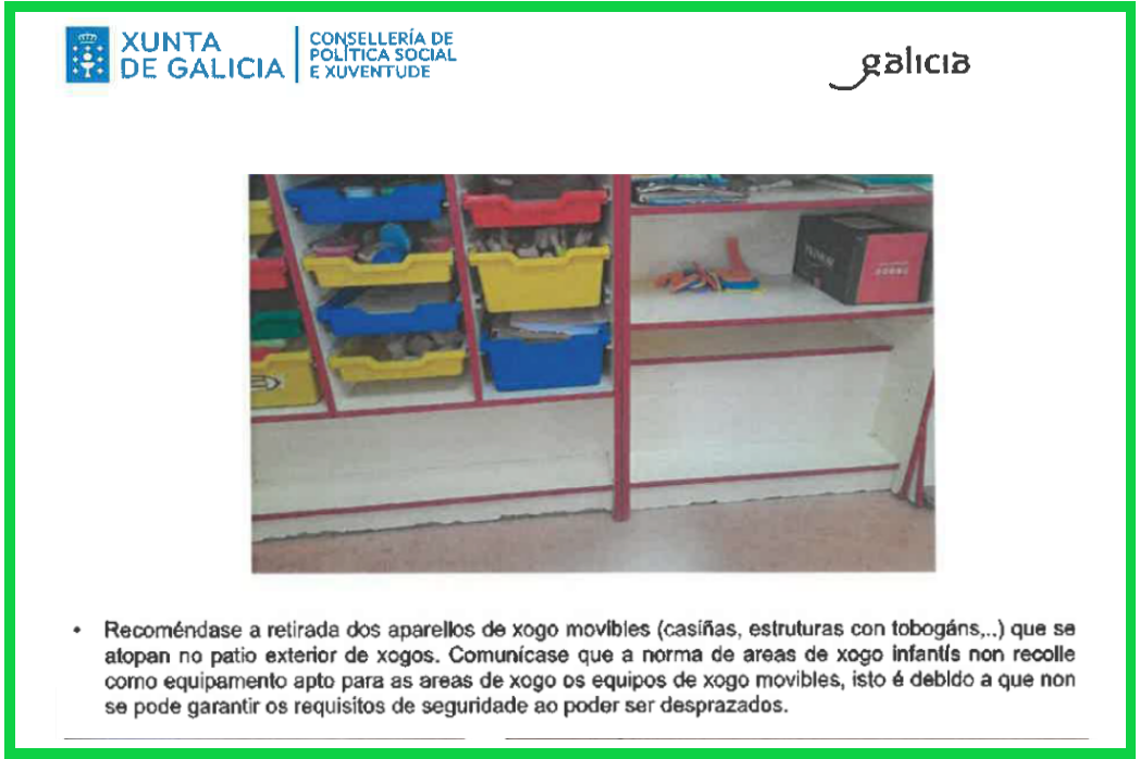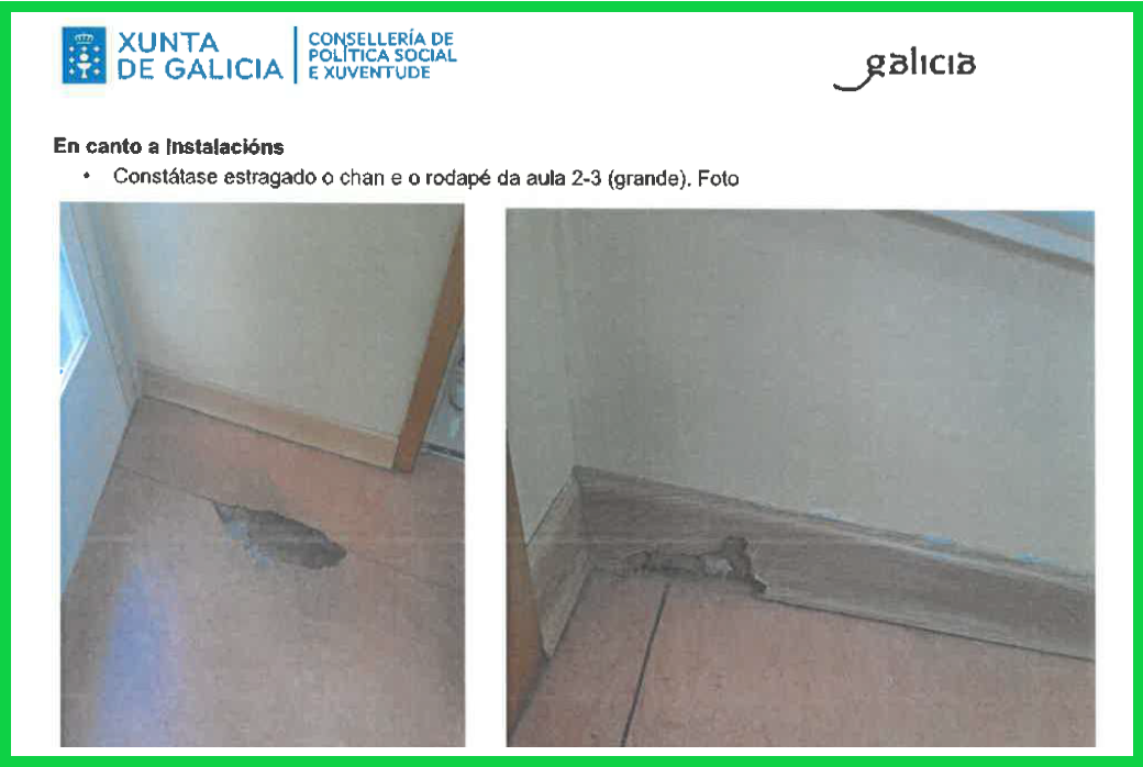 O informe da inspección contén, como dixemos, todo tipo de deficiencias. Por unha banda nas propias instalacións, con mobles, rodapés e plaquetas rotas que poden provocar cortes ou feridas nos nenos e nenas, e mobiliario tamén roto polo desgaste do uso e sen renovar ou que non é apto para o seu uso en escolas infantís.