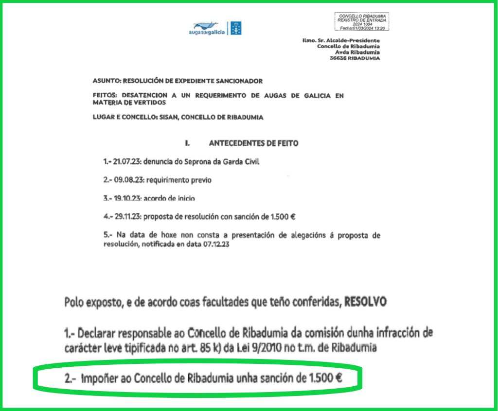 - 1.500 € por “desatención a un requirimento de Augas de Galicia en materia de verquidos”.