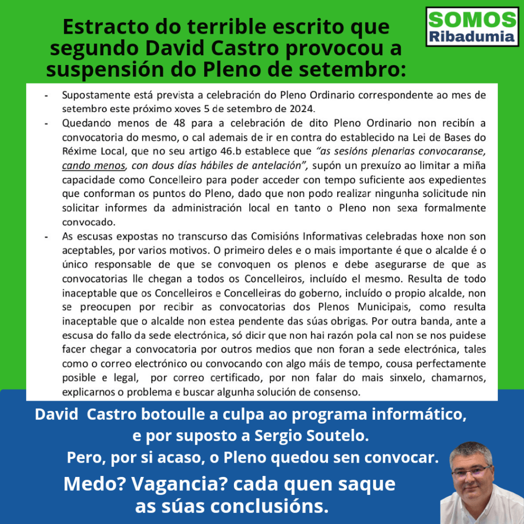 Dende Somos Ribadumia non saímos do noso asombro ante o último despropósito de David Castro. En verbas de Sergio Soutelo, “o resume sería que primeiro non convocou un pleno do que sabia a data dende fai dous anos, logo convocouno fora dos prazos legais, , logo de convocalo suspendeu a convocatoria sen avisar a ningún dos partidos da oposición, e por último, podendo convocar o Pleno para un día máis tarde, unha semana despois segue sen convocarse e non se ve intención de que o vaia facer”. Como ademais, non contento con facer o ridículo cunha moi burda estratexia para evitar realizar un Pleno que é obrigatorio por lei, aínda tivo a ben culpar a Somos Ribadumia, queremos deixar constancia dos feitos.