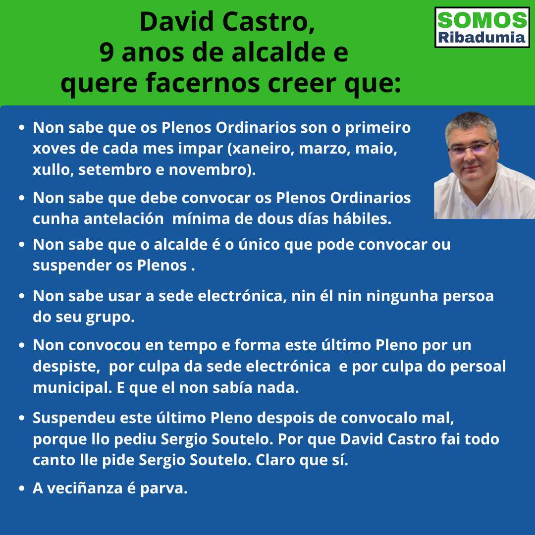 Dende Somos Ribadumia non saímos do noso asombro ante o último despropósito de David Castro. En verbas de Sergio Soutelo, “o resume sería que primeiro non convocou un pleno do que sabia a data dende fai dous anos, logo convocouno fora dos prazos legais, , logo de convocalo suspendeu a convocatoria sen avisar a ningún dos partidos da oposición, e por último, podendo convocar o Pleno para un día máis tarde, unha semana despois segue sen convocarse e non se ve intención de que o vaia facer”. Como ademais, non contento con facer o ridículo cunha moi burda estratexia para evitar realizar un Pleno que é obrigatorio por lei, aínda tivo a ben culpar a Somos Ribadumia, queremos deixar constancia dos feitos.