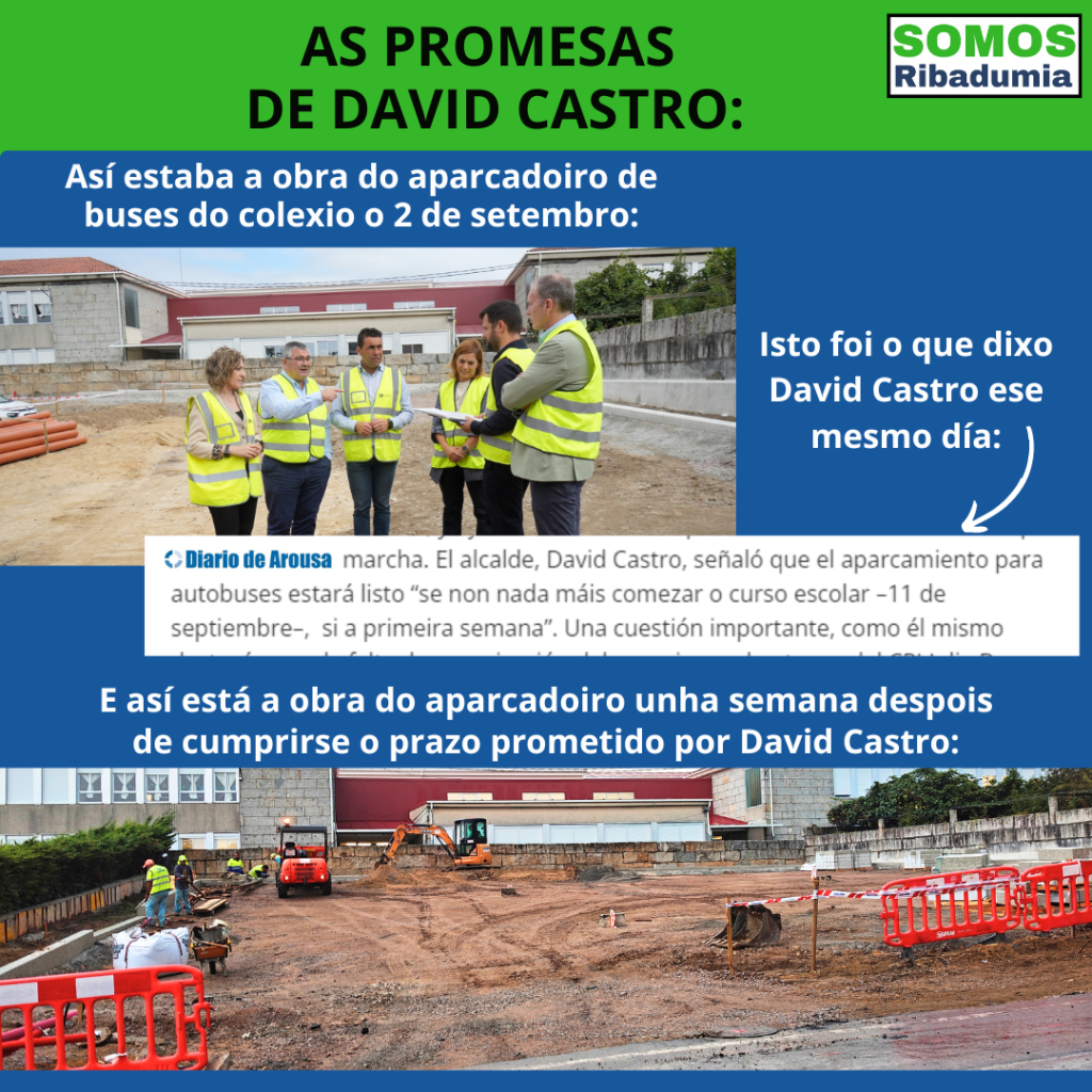David Castro declarou aos medios de prensa o pasado 2 de setembro que o aparcadoiro de buses que se esta realizando nunha finca da rúa condesa estaría listo “se non nada máis comezar o curso escolar – 11 de setembro –, si a primeira semana”. Pois estamos a 20 de setembro, e o aparcadoiro está practicamente igual que estaba o día que David Castro sacou peito presumindo dunha rapidez que non é acorde á realidade.