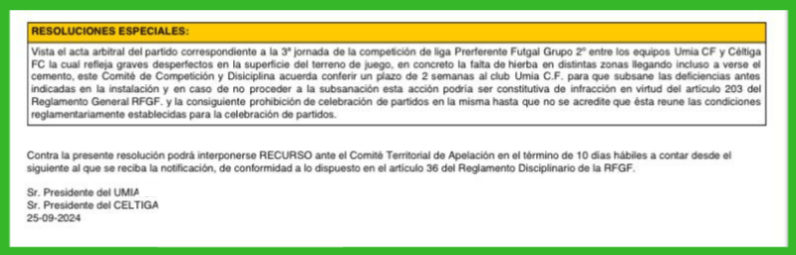 De Feito, o pasado domingo o árbitro que pitou o partido entre o Umia C.F. e o Celtiga C.F. recolleou en acta a situación do campo, dándolle dúas semanas ao Umia -ats o próximo encontró – para resolver a situación, cousa que o club obviamente non vai poder facer.