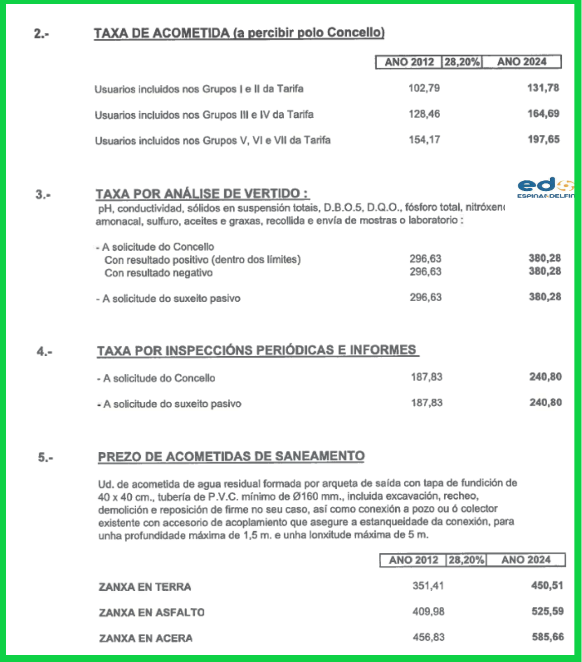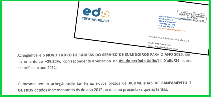 A proposta de actualización, escudándose en que a última actualización foi no 2012, e en que dende entón o IPC subiu un 28,20%, inclúe a solicitude expresa de que se aprobe nos termos propostos, o cal implicaría unha importante suba para a veciñanza e as empresas do noso Concello. En concreto, esta suba suporía pasar dos 48.40 € actuais (ive engadido) aos 62,51 € no caso das vivendas, e dos 105,08 € aos 134,71 € para pequenos negocios, escalando prezos en toda a táboa ata chegar ao máximo para as grandes empresas, que pasarían de pagar 1.155 a pagar 1480,71 €. A mesma porcentaxe de suba aplicaríase ao resto de servizos incluídos no contrato de xestión.