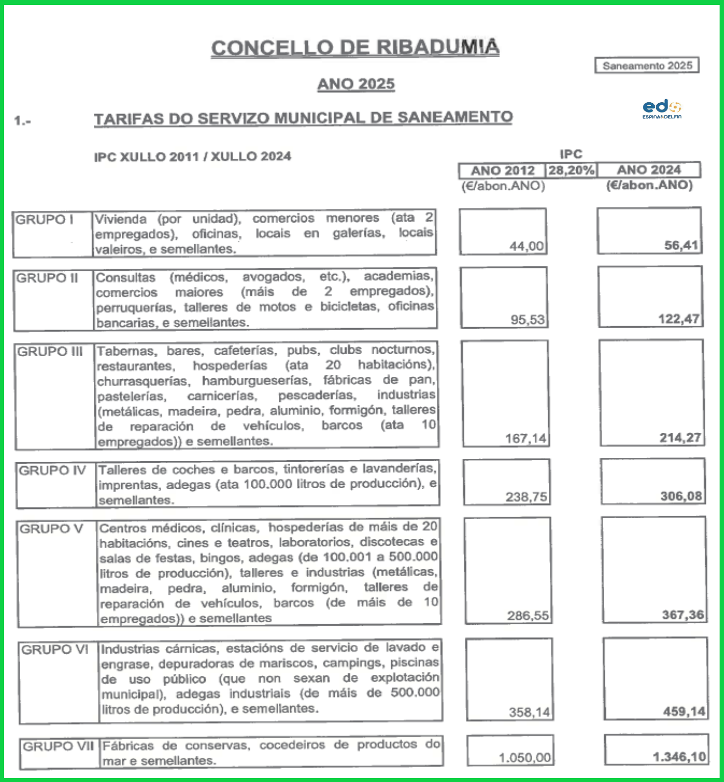 - O recibo pasará de 48.4€ a 62,51€ (IVE endadido) para as vivendas, e con subas de 30€ a 300€ para as empresas, un auténtico sablazo.