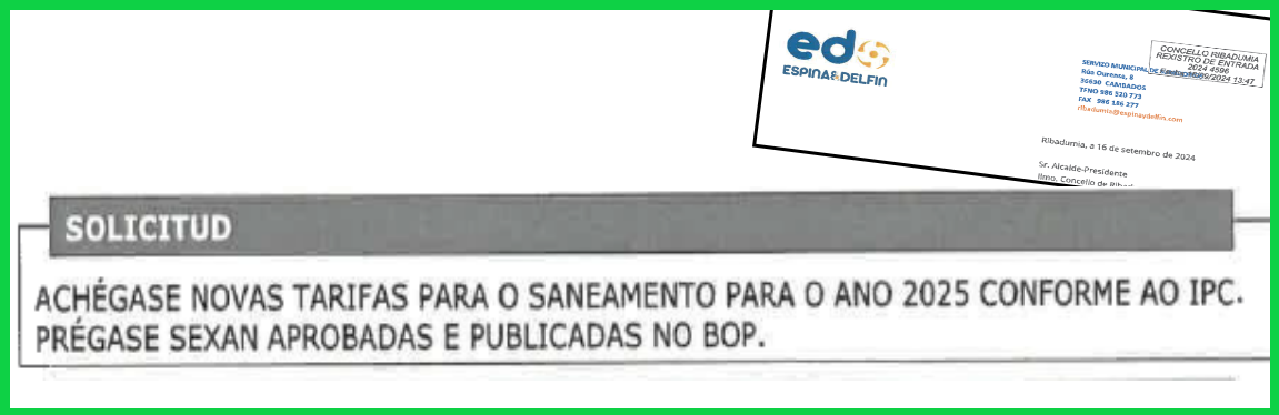 Dende Somos Ribadumia vimos de ter constancia de que o pasado mes de setembro a empresa concesionaria da xestión do saneamento municipal realizou ao Concello de Ribadumia unha proposta de actualización das taxas de saneamento, tanto das de uso da rede, como do resto de taxas relacionadas con este servizo básico, acometidas, análises e inspeccións.