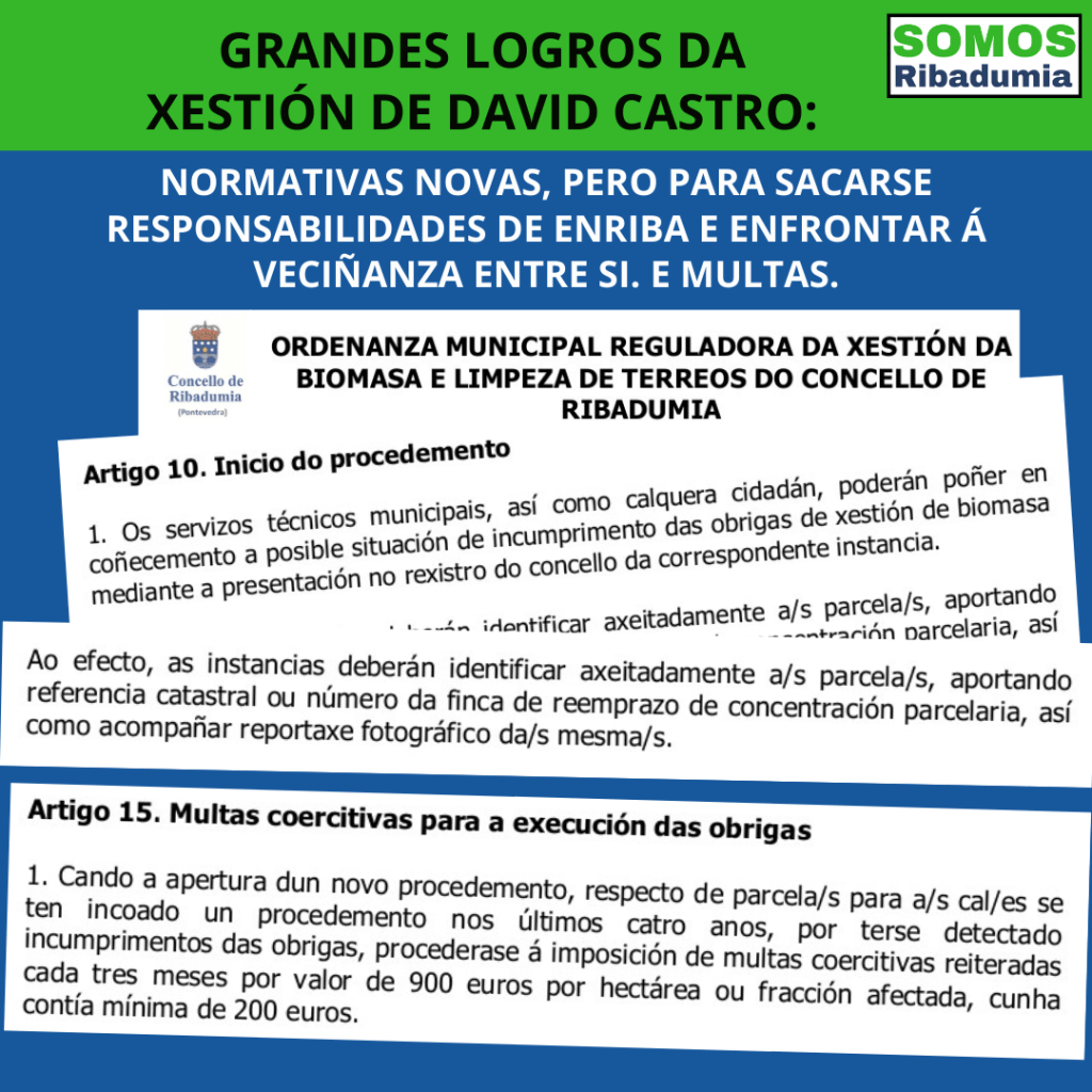 Unha cuestión a remarcar que propoñemos é que o Concello saque a concurso -asumimos a incapacidade de David Castro para xestionalo directamente – un contrato para a limpeza de parcelas, creando así un servizo municipal de limpeza de parcelas. Esta medida permitiría aportarlle á veciñanza unha alternativa pública, a prezos razoables, e facilitar e abreviar a xestión no caso de limpezas subsidiarias. E dicimos isto sabendo que existe a posibilidade de que Seaga se faga cargo, pero é un servizo que non vemos que estea funcionando moi ben, de feito existen queixas por como xestionan a limpeza de montes – que é arrasando todo sen contemplacións – ata o punto de que a norma proposta por David Castro nin sequera contempla a posibilidade de acudir a esa vía, e ademais nós apostamos por unha xestión mais próxima á veciñanza.