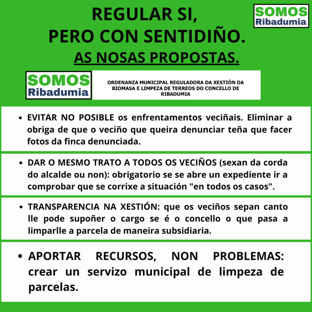 Dende Somos Ribadumia analizamos debidamente todo o texto, e ademáis das cuestións que vimos de expor, topamos algún axuste máis que consideramos que debe realizarse e que melloraría unha norma que entendemos que pode ser necesaria, pero que non pode pensarse como un mecanismo de exención de responsabilidades políticas, e si debe aportar ferramentas que faciliten a sensibilización e participación da veciñanza na prevención de incendios. “Mais colaboración, máis recursos, menos denuncias e menos multas”. Por este motivo, presentamos unha serie de melloras ao documento que propón o goberno local, para corrixir incoherencias e as cuestións arriba mencionadas, e aportando algunha proposta que consideramos moi necesaria.