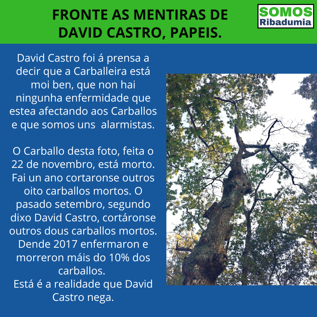 En resumo, David Castro é moi dado a sinalar de mentireiros aos demais, pero a realidade é moi terca e no caso da Carballeira está á vista de todo o mundo: cada ano que pasa dende que David ten a maioría absoluta, menos carballos, rareas innecesarias, arbores mortes e enfermidades que non se están tratando, informes que non existen e declaracións falsas para tapar a realidade. E mentres David Castro enreda, a carballeira está morrendo.