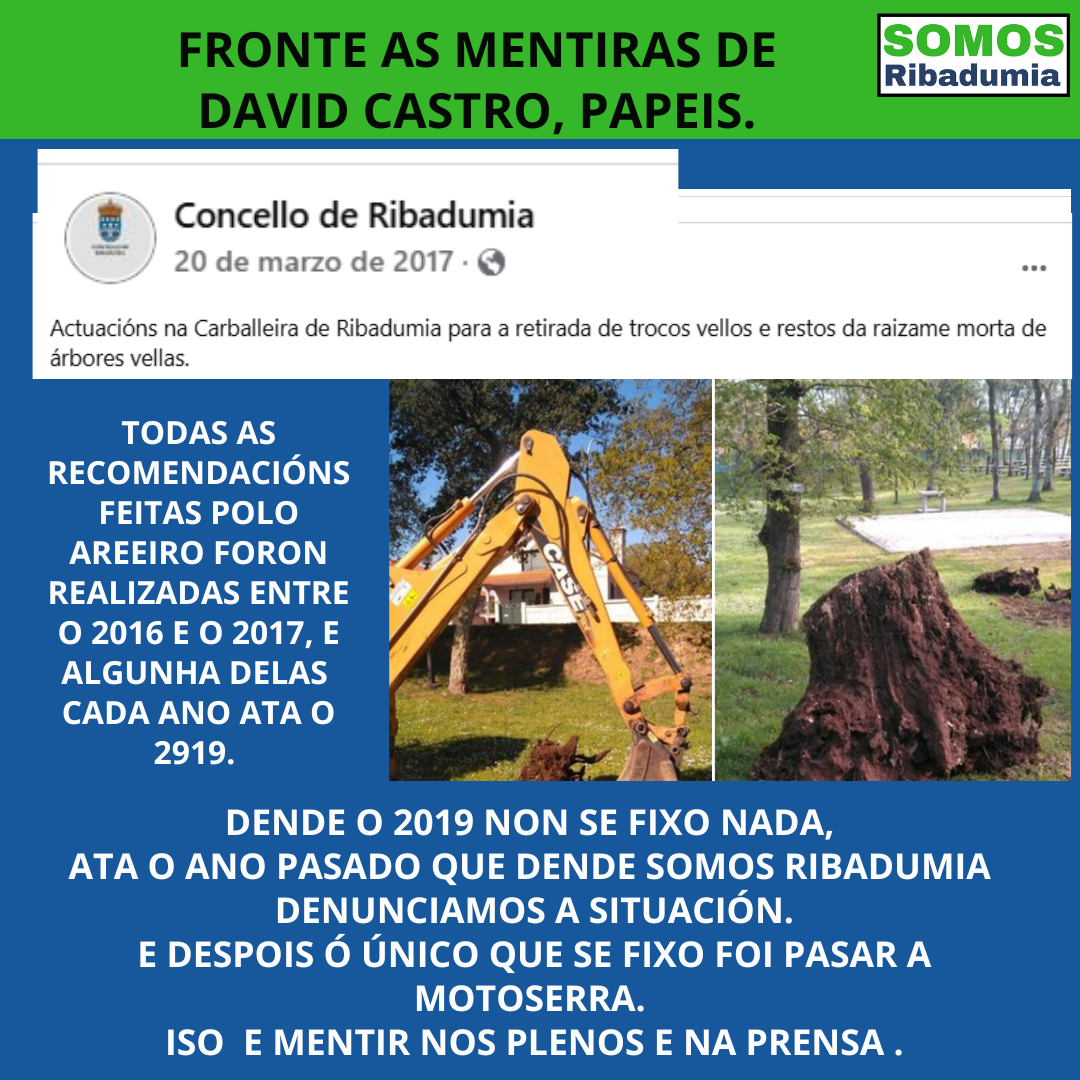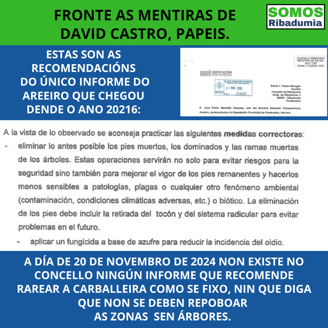 O que non queda moi claro é como pode ser que, se a visita dos técnicos do Areeiro se realizou tal e como declarou no pleno de outubro a Concelleira Vanesa Jorge antes da rarea, puideran emitir un informe dicindo que a carballeira agora está en mellores condicións debido a unha rarea que aínda non se realizara naquel momento. Mentira enriba de mentira pois, insistimos, non existe informe desa suposta visita. Por certo ,si existen informes de visitas anteriores, a primeira no ano 2007 cando se detectaron as primeiras árbores enfermas, pois os problemas da carballeira veñen de lonxe, logo outro no 2009, para comprobar que os tratamentos dados naquel momento funcionaron. Todo isto está na hemeroteca e documentado no rexistro do Concello, igual que o informe de 2016, a diferenza dos supostos informes aos que se refire o señor Castro, dos que non hai constancia algunha.