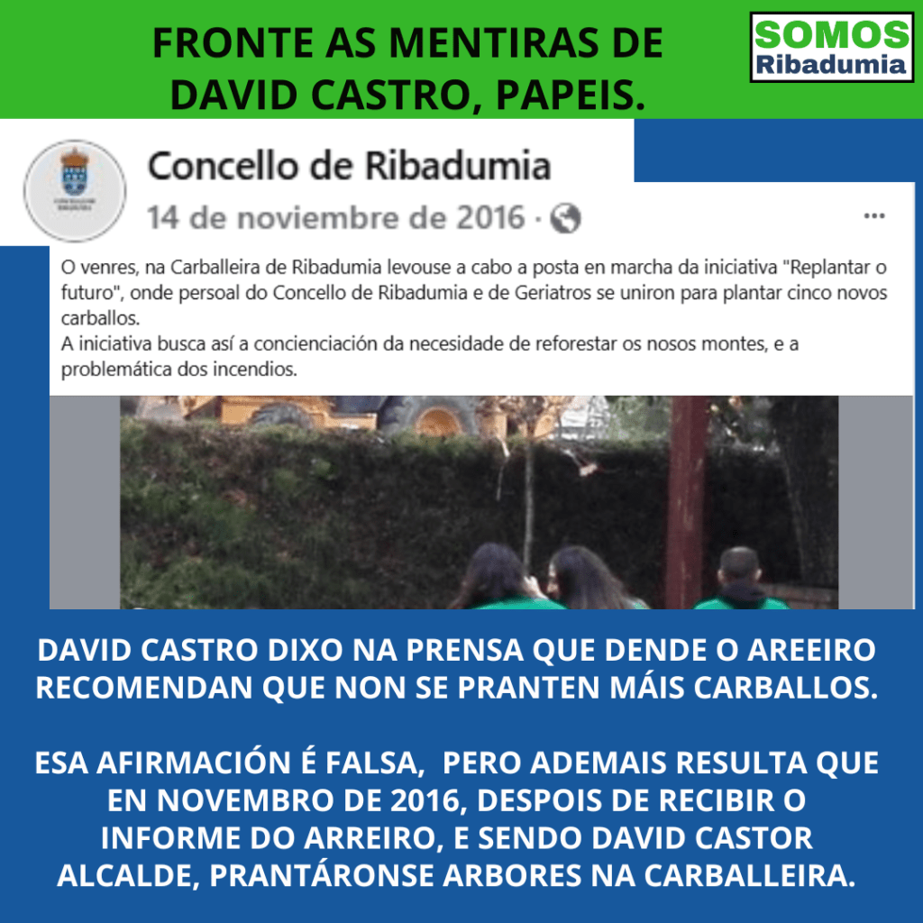 Outra cuestión á que se refire o goberno é a que repoboar a Carballeira iría contra os supostos informes do Areeiro. Outra mentira, no único informe existente dende a chegada de David Castro non se di nada diso. Pero ademais, resulta que sendo David Castro alcalde e con posterioridade a ese informe da EFA, plantáronse carballos. En concreto cinco árbores o 11 de novembro de 2016, nunha actividade conxunta co xeriatrico. E isto fíxose, porque do mesmo xeito que nunha zona da carballeira a densidade era alta, noutra parte, nunha superficie que ocupa a metade da mesma, quedan ocos moi grandes que se pretendían cubrir. Pero a realidade é que naquel momento no goberno estaba Somos Ribadumia, e hoxe David Castro prefire ter sitios para palcos antes que carballos.
