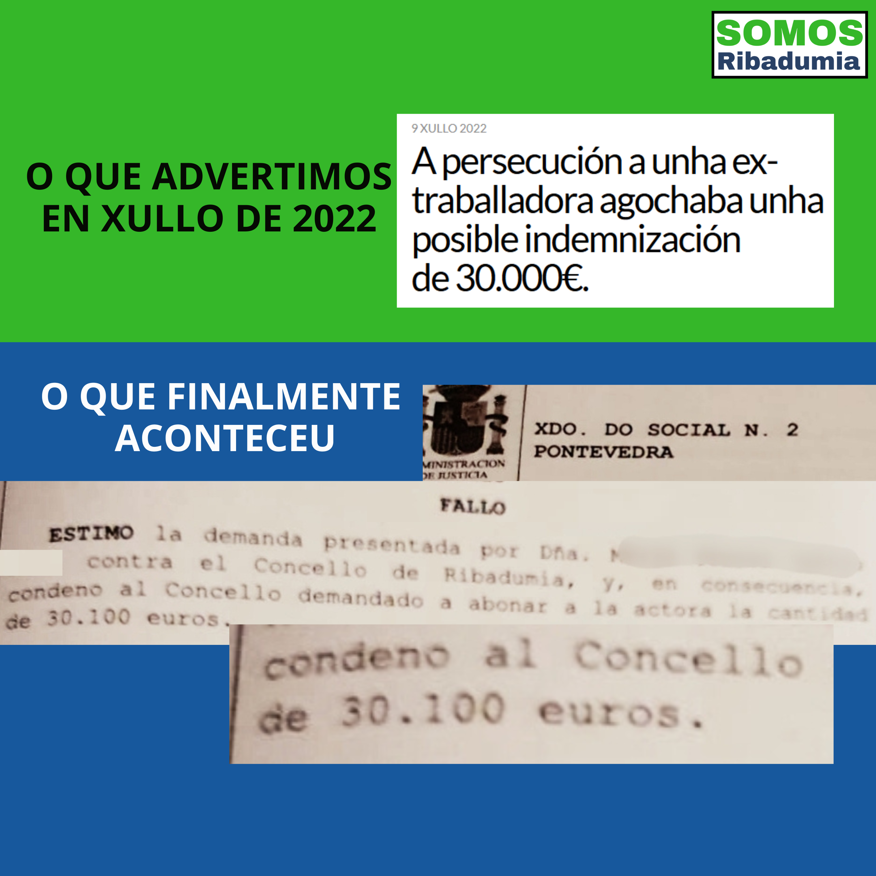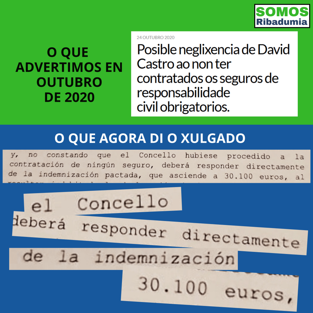Posteriormente a traballadora reclamou o seu dereito a percibir unha indemnización recollida no Convenio. O Concello presentou alegacións contra esa reclamación e fai unhas semanas, concretamente o 26 de novembro, o xulgado do social n° 2 de Pontevedra ditou sentenza dando a razón á traballadora, condenando ao Concello a pagarlle unha indemnización de 30.100 €. Non só iso, a propia sentenza establece que, tal como dende o noso partido informamos fai meses, o Concello non contaba no seu momento co seguro – obrigatorio – que debería facerse cargo deste tipo de indemnizacións polo que o Concello, gracias a incompetencia e desidia de David Castro, deberá aboar esa cantidade con fondos públicos.