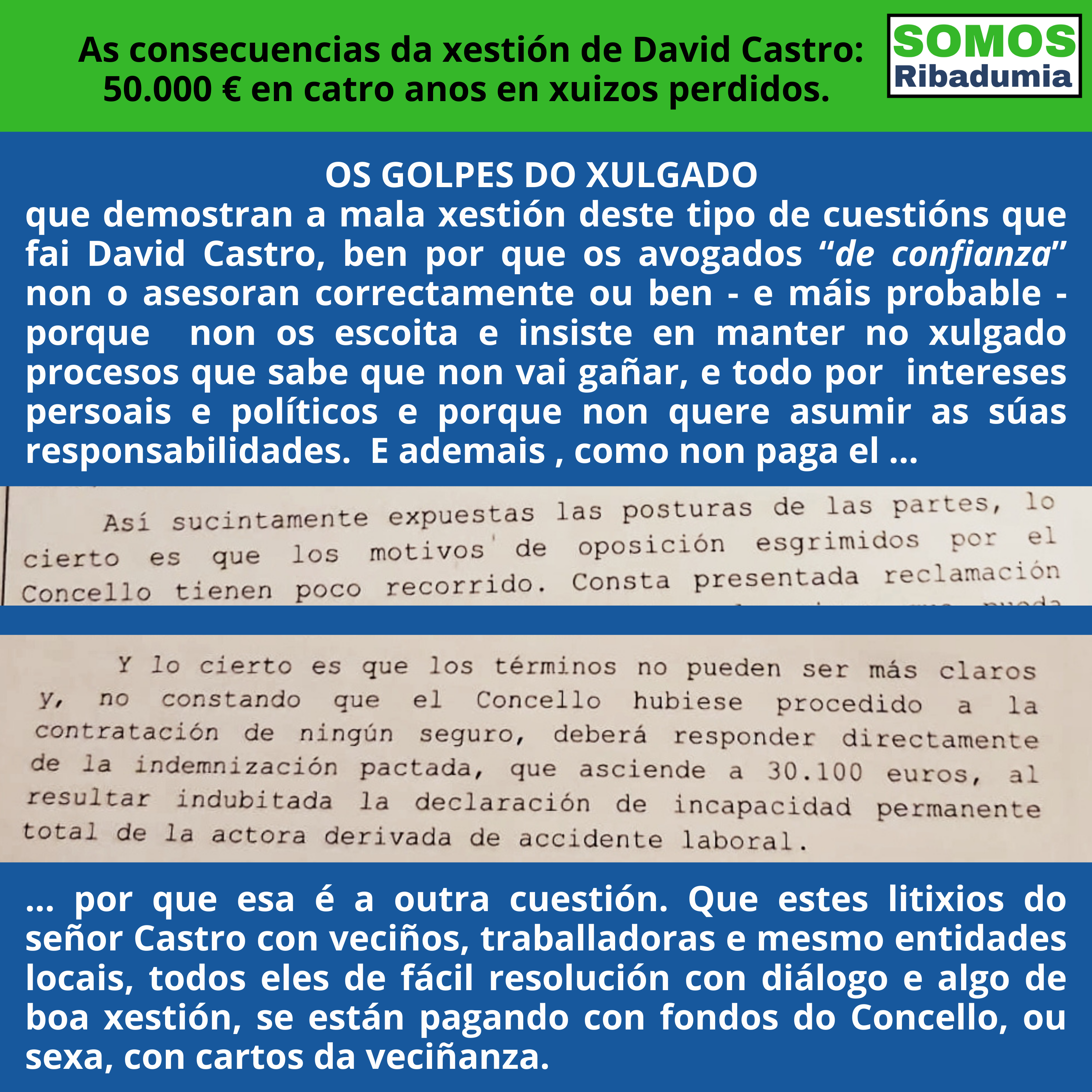 - David Castro dilapida cartos públicos en procesos xudiciais contra veciños e traballadores. 50.000€ en catro anos.