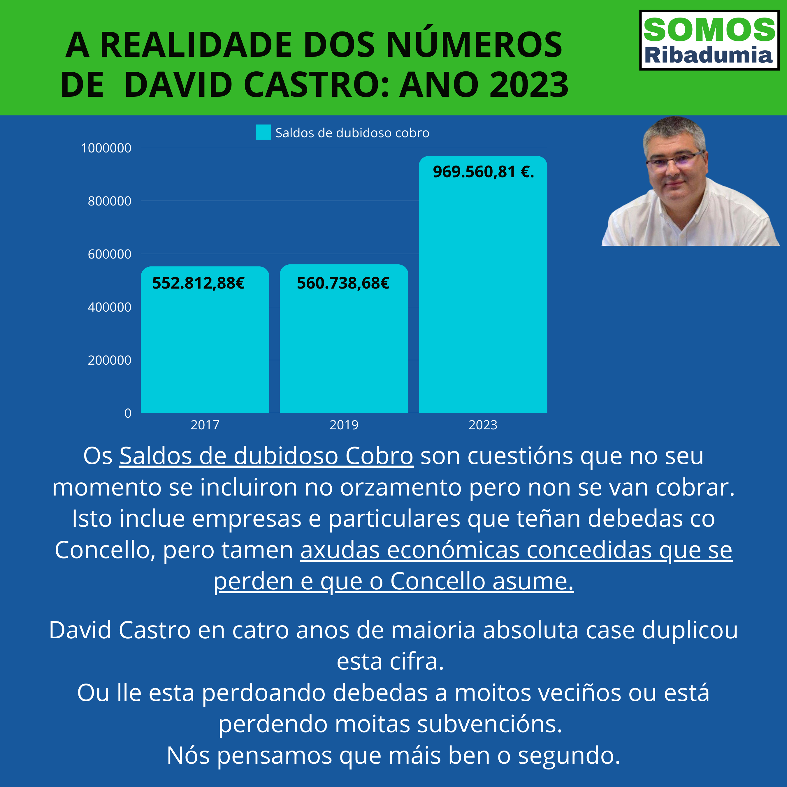 Case 1 millón de euros de dubidoso cobro. Ou a moitas empresas e particulares este Concello lle está perdonando pufos ou moitas subvencións se están perdendo. Dende Somos Ribadumia temos moi claro que máis ben o segundo. O goberno do señor Castro leva perdidos máis de 2M de Euros en axudas, dende que é alcalde en solitario, e a boa parte deles tivo que facerlle fronte o goberno con fondos propios, e iso queda refrectido na cifra de Saldos de Dubidoso Cobro.