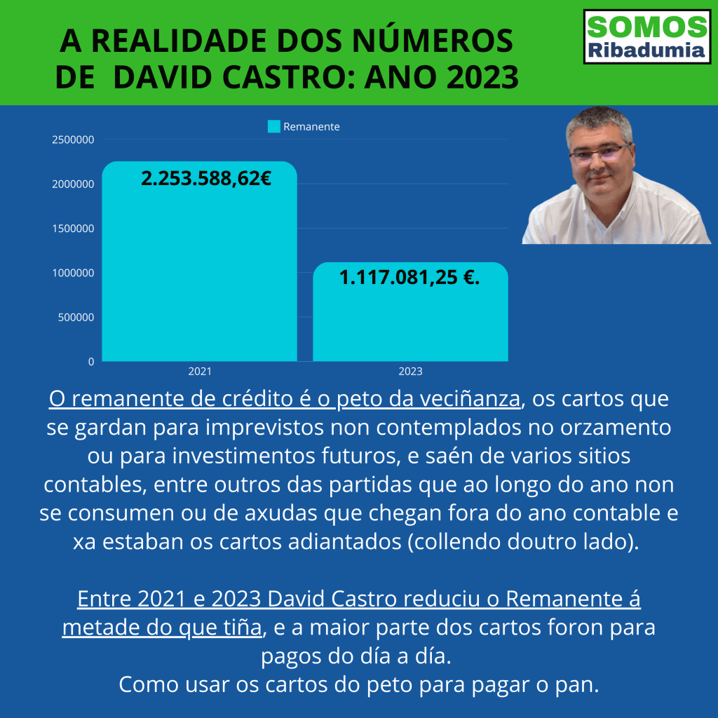 O remanente acumulado finalmente quedou en 1’1 Millóns. A Concelleira encheuse a boca a falar que ese é un bo dato, pero a realidade é que dos 2.253.588,62€ que había de remanente a peche de 2021, xa so quedaban a peche de 2023 1.117.081,25 €.
