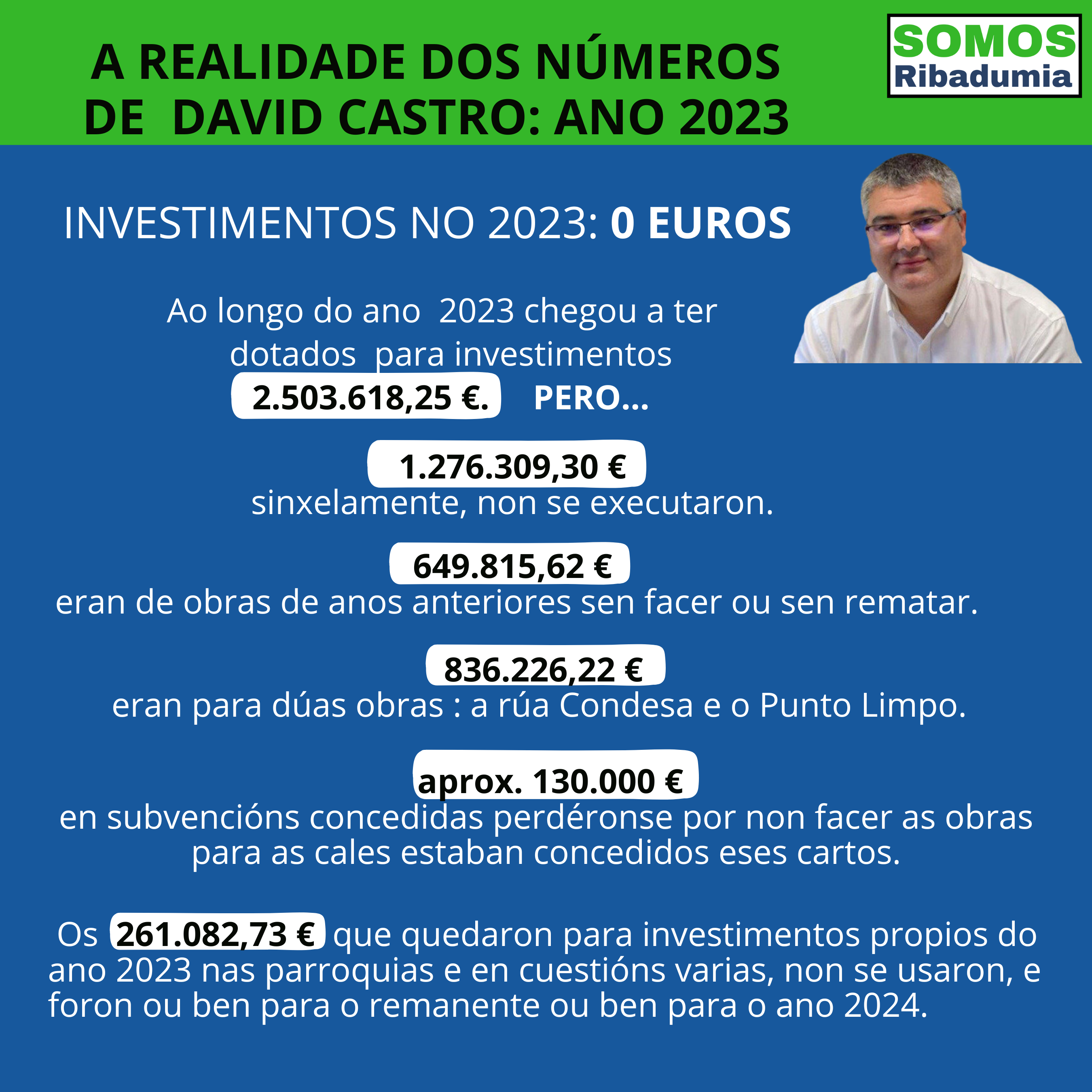 Ou sexa, David Castro empezou 2023 xa con obras por valor de máis de medio millón sen facer. Descontando isto, a dotación para investimentos propios do 2023 foi de 1.853.802,63 €. Desta cantidade, 836.226,22 e eran e seguen sendo para as obras da rúa condesa e para a ampliación do punto limpo.