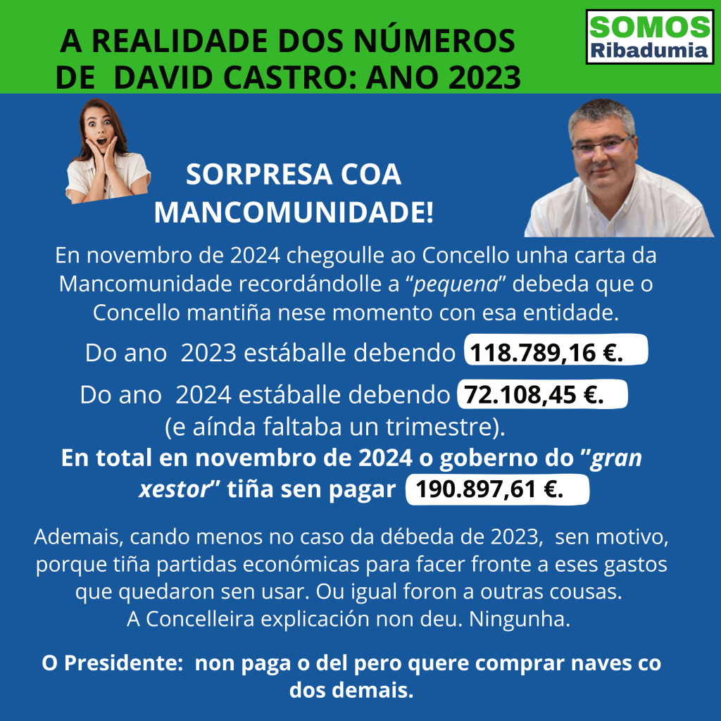 Por exemplo, a ver por que non se pagou a letra da compra de terreos para a EDAR nin a da planta fotovoltaica, estando as partidas dispoñibles e con fondos. A donde foron eses cartos? “David Castro é Presidente da Mancomunidade, e pretende que os Concellos compren naves, regalen terreos as empresas privadas para que monten xeriatricos, paguen liberacións … pero resulta que el non paga nin os cafés”.