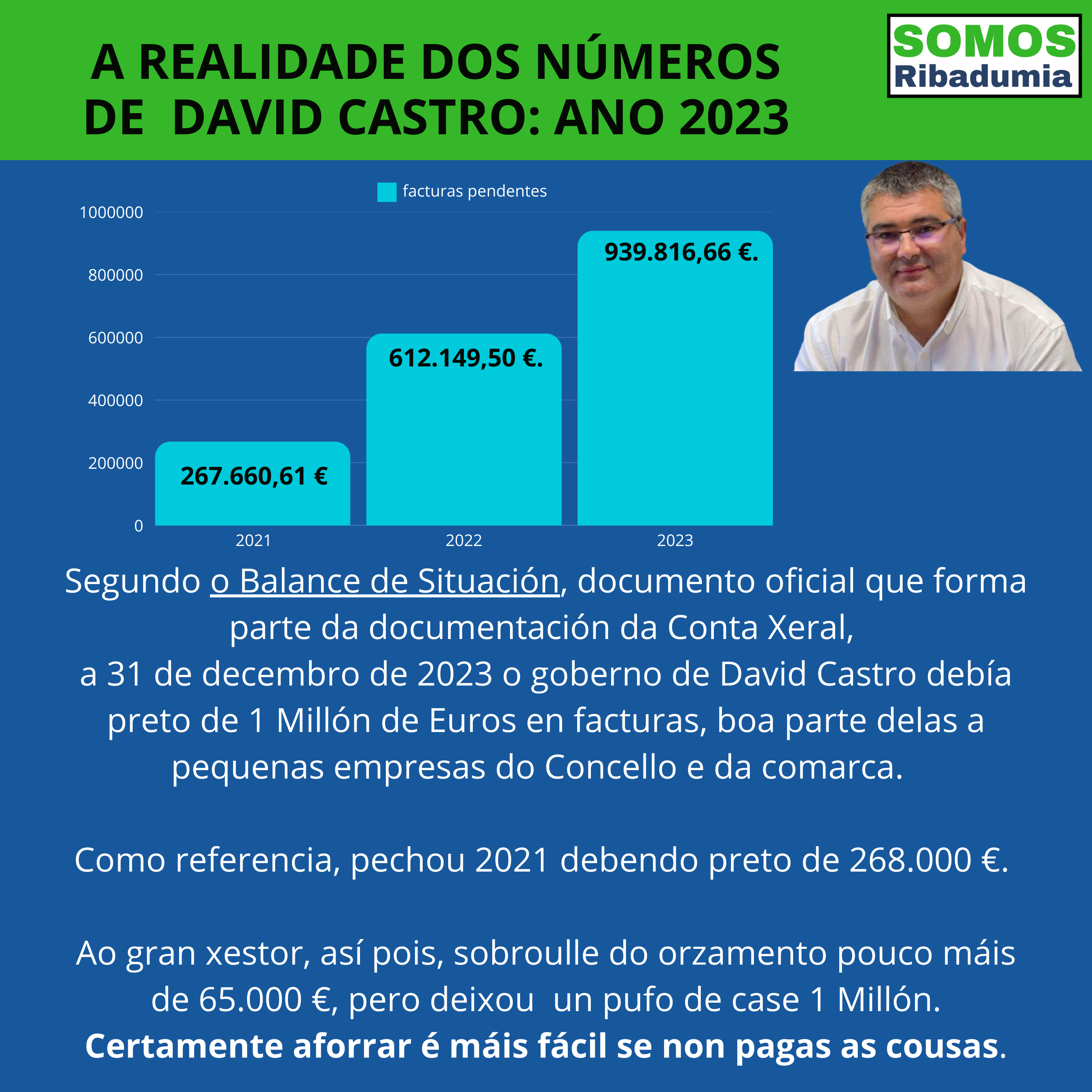 A Conta Xeral deu resultado positivo, como dixemos 65.369,36 €,. Pero segundo o Balance de Situación das contas, a 31 de decembro de 2023 o goberno debía 939.816,66 €. En facturas pendentes de pagar. Como referencia a peche do 2021 a débeda era de 267.660,61 € , e no 2022 esta cifra disparouse ata os 612.149,50 €.