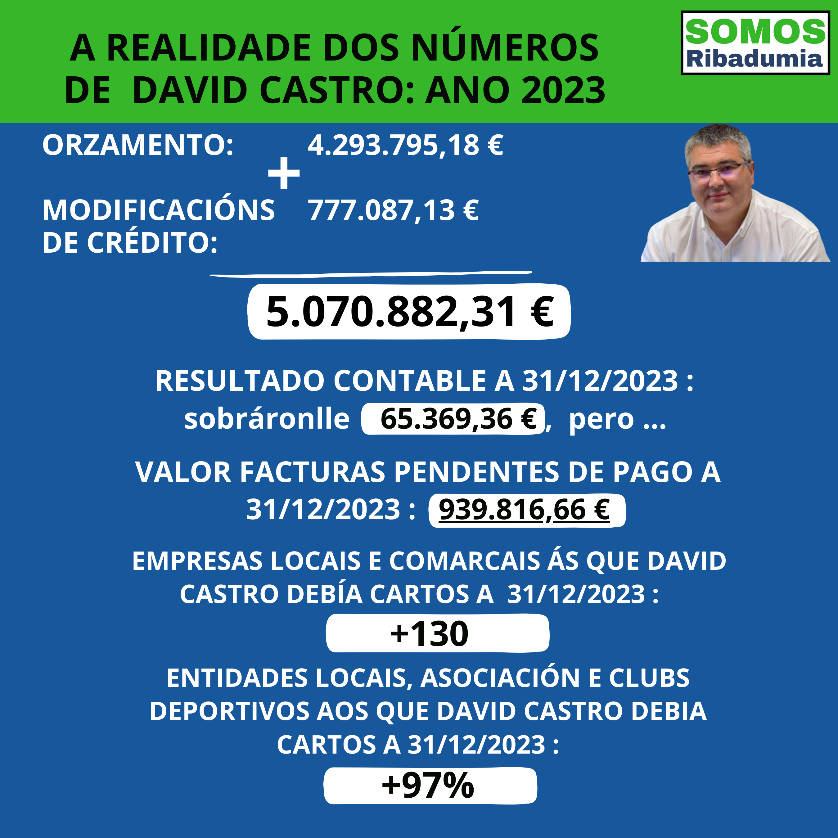 E esta é a realidade da xestión do goberno , cantada polos números que eles levaron a Pleno. Para rematar, compre recalcar que os erros detectados que confirmou tanto o goberno como o resto da oposición, non se corrixiron e tampouco se incluíu a documentación que faltaba, polo tanto aprobouse un documento con datos falsos a sabendas. David Castro, pois, minte e engana á veciñanza de Ribadumia, e faino ademais de maneira descarada. .